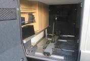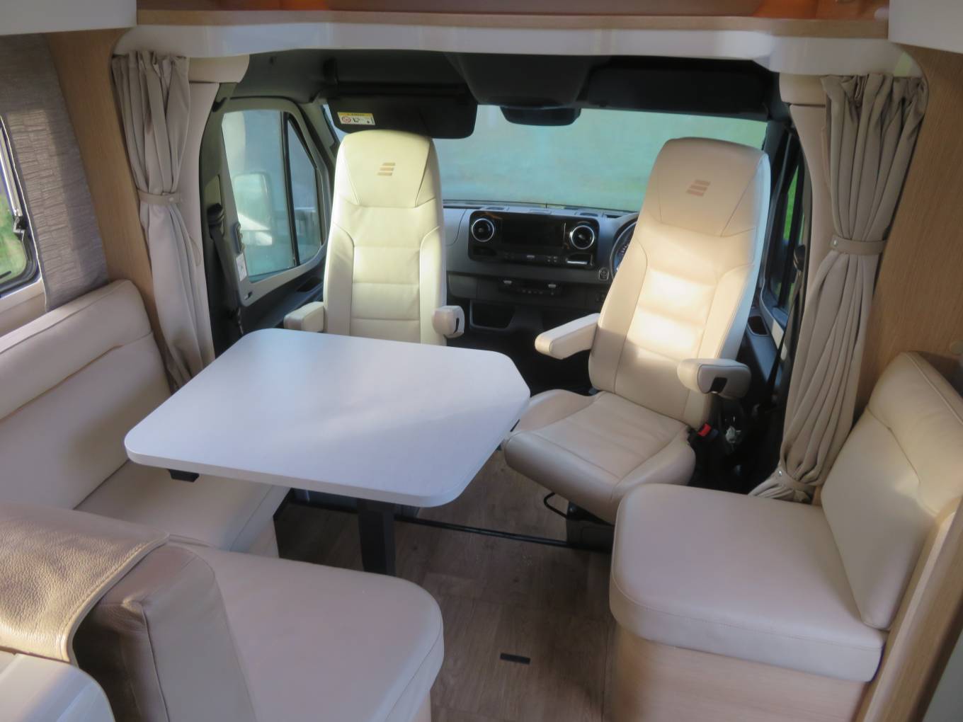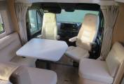 Designed for 2 to 4 travellers, this motorhome features four rear seat belts and two forward-facing seats that transform into a spacious double bed. The front seats swivel to create a central dining area perfect for entertaining, enjoying meals, or simply relaxing with the TV. An adjustable table, curtains for privacy, and abundant cupboard space make this area both practical and inviting.