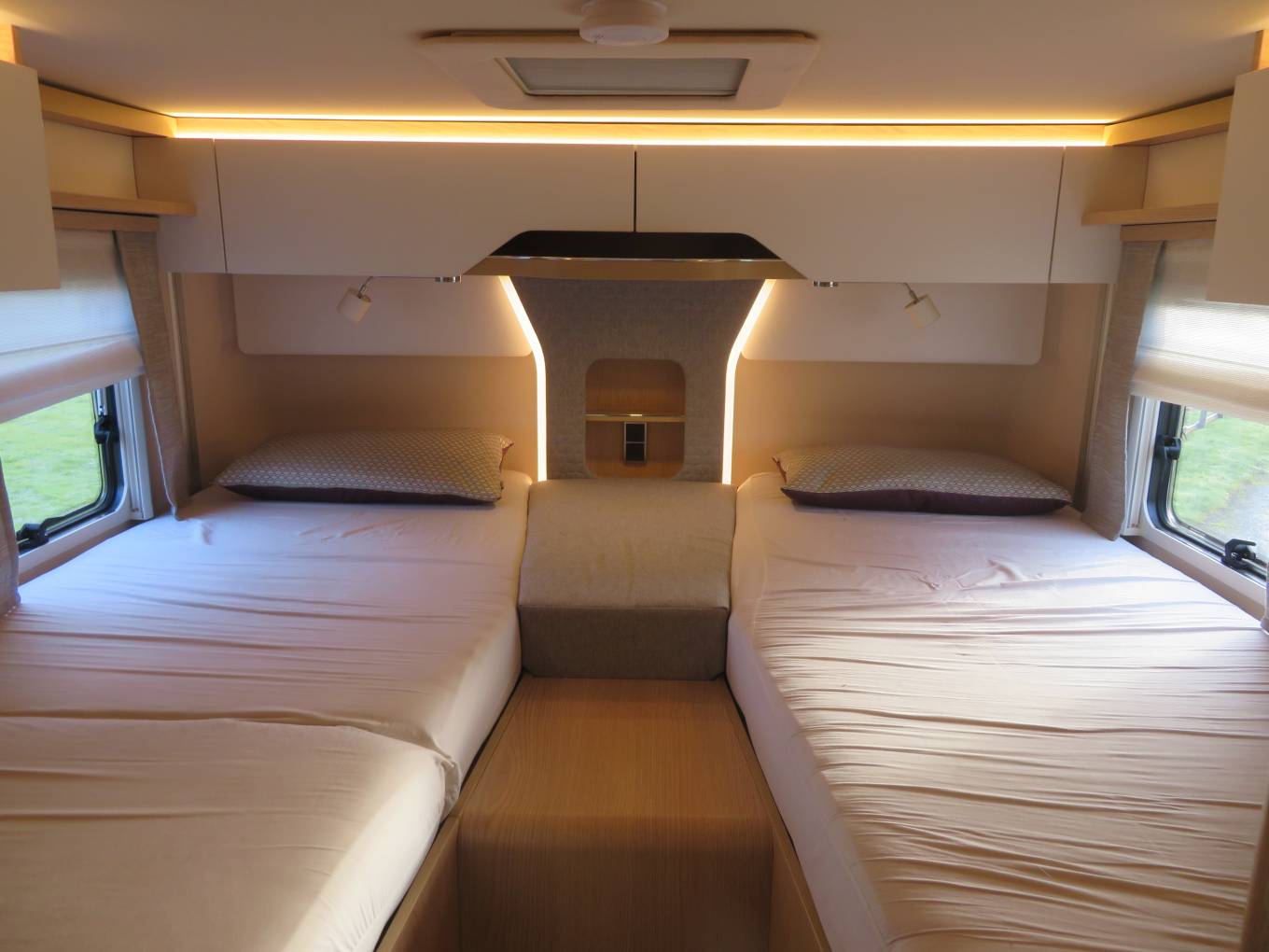 The rear of the Hymer BML-T780 is a sanctuary of comfort with two fixed single beds that can be converted into a large double. Ample storage units, wardrobes, and cupboards ensure you can bring all the comforts of home with you.