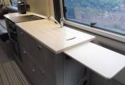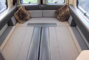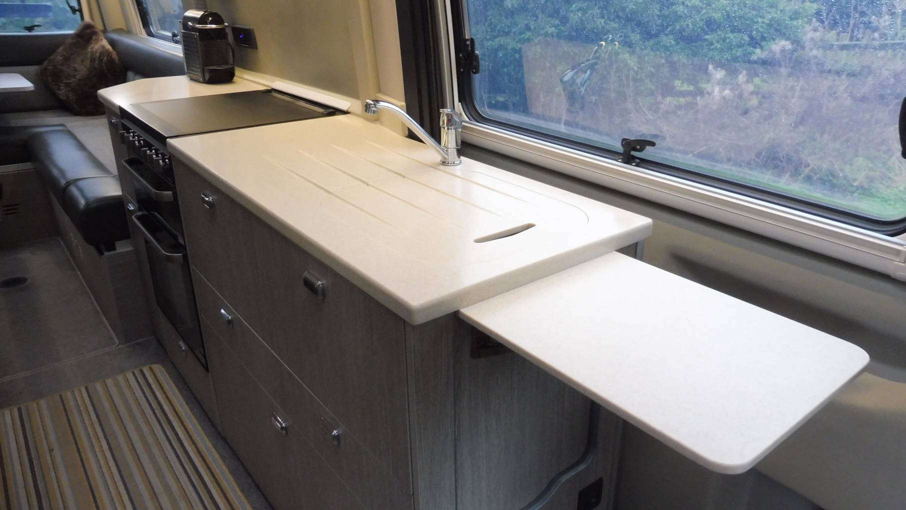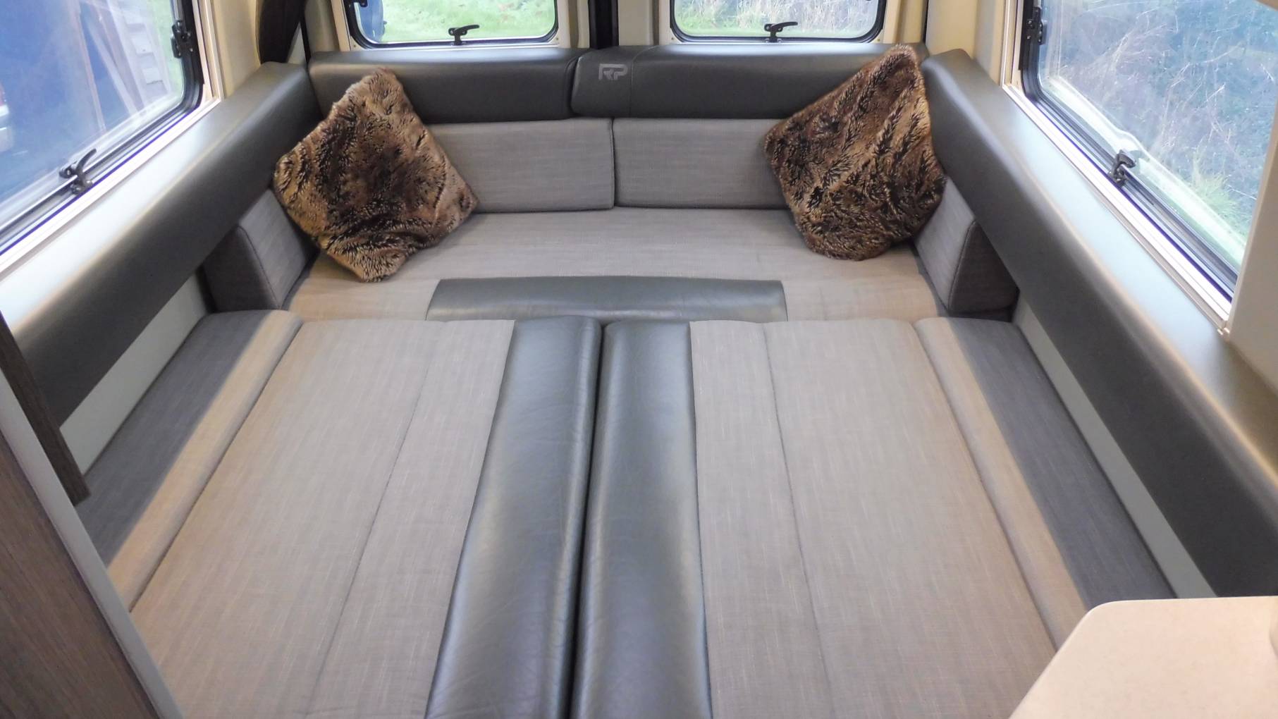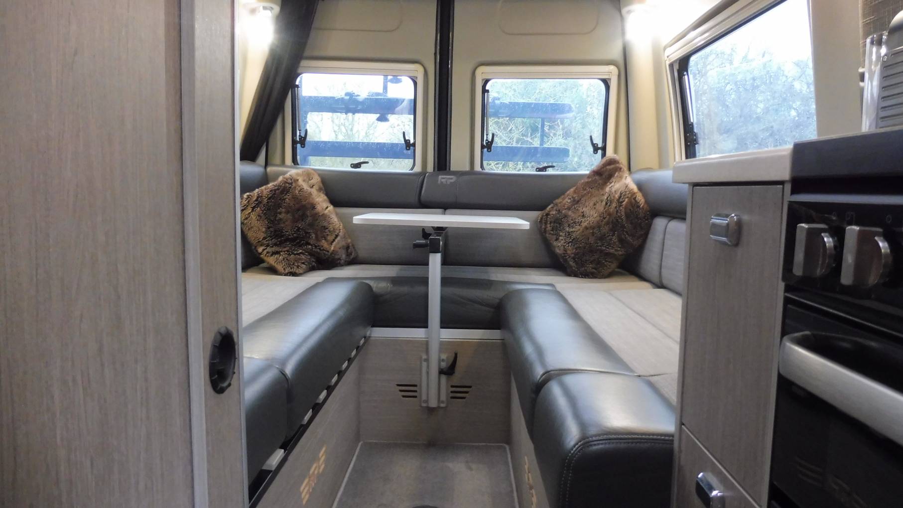 Enter the habitation area through the electric sliding door and the RP Motorhomes build quality is evident throughout. At the rear, the huge U-shaped lounge is the focal point with supportive seating, clothed in a practical half leather, and loads of storage options. At night this is easily converted into a huge double bed or, alternatively, can be used as singles. The Truma Aventa habitation air-conditioning unit ensures your comfort in hotter climes.
