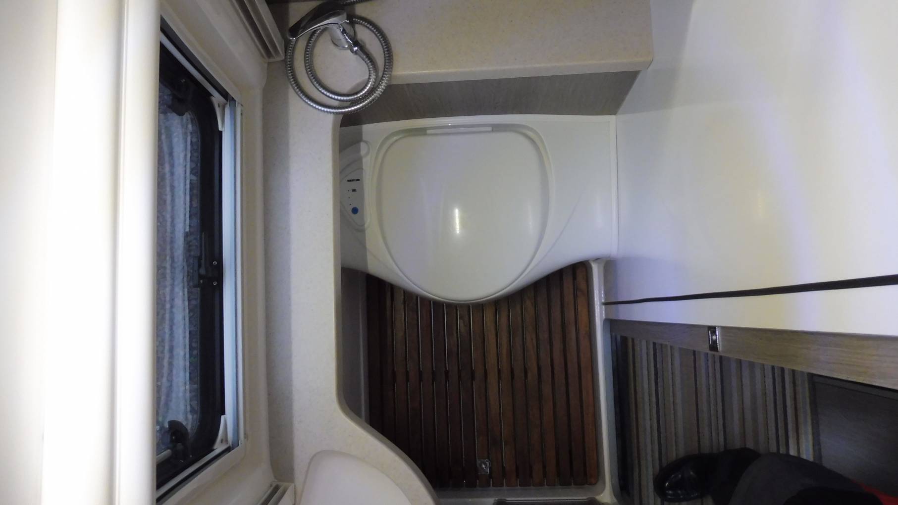 Opposite you will find a compact washroom with Thetford chemical toilet, vanity sink with shower over and a couple of mirrored cabinets.