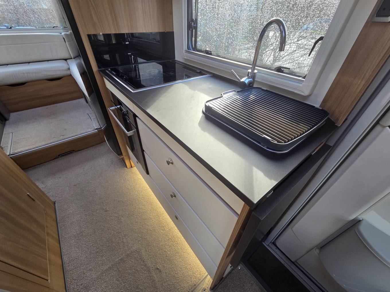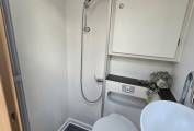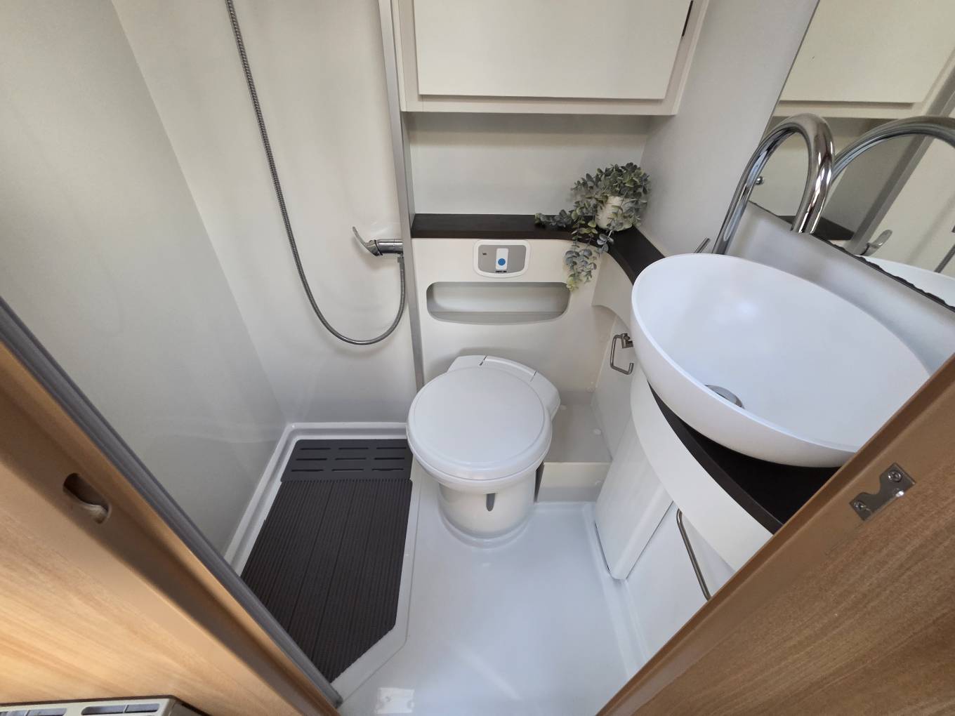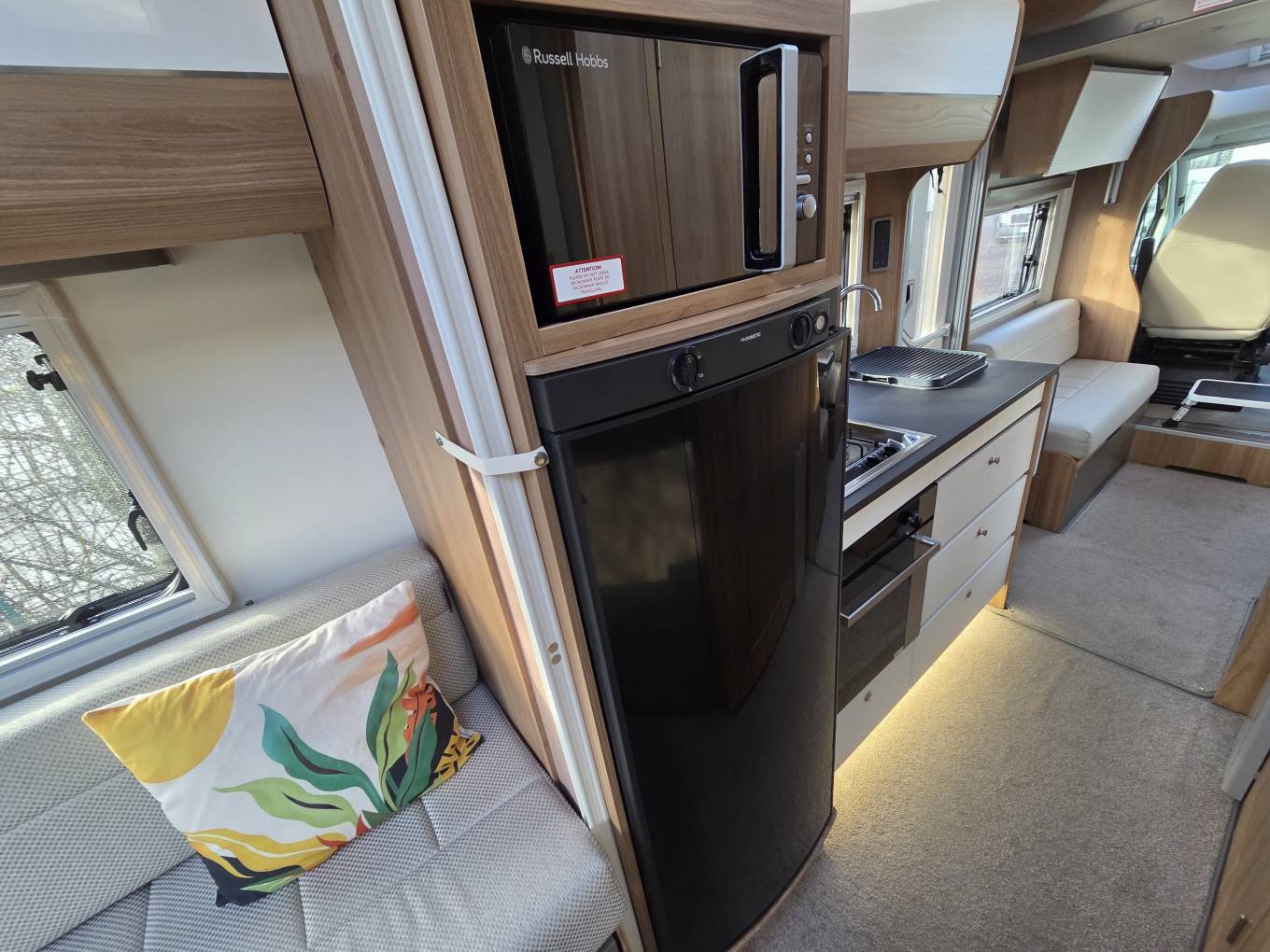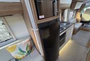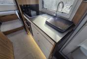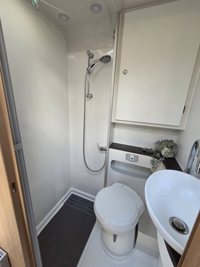 The fully-equipped kitchen includes a full oven and grill, a combination of three gas and one electric hob, a sink with a mixer tap, ample drawer and cupboard storage, a large three-way fridge-freezer, and a microwave. The washroom offers a shower, cassette toilet, cupboard, and a generously sized mirror. A wardrobe provides additional space for clothes and conveniently stores the dining table and ladder.