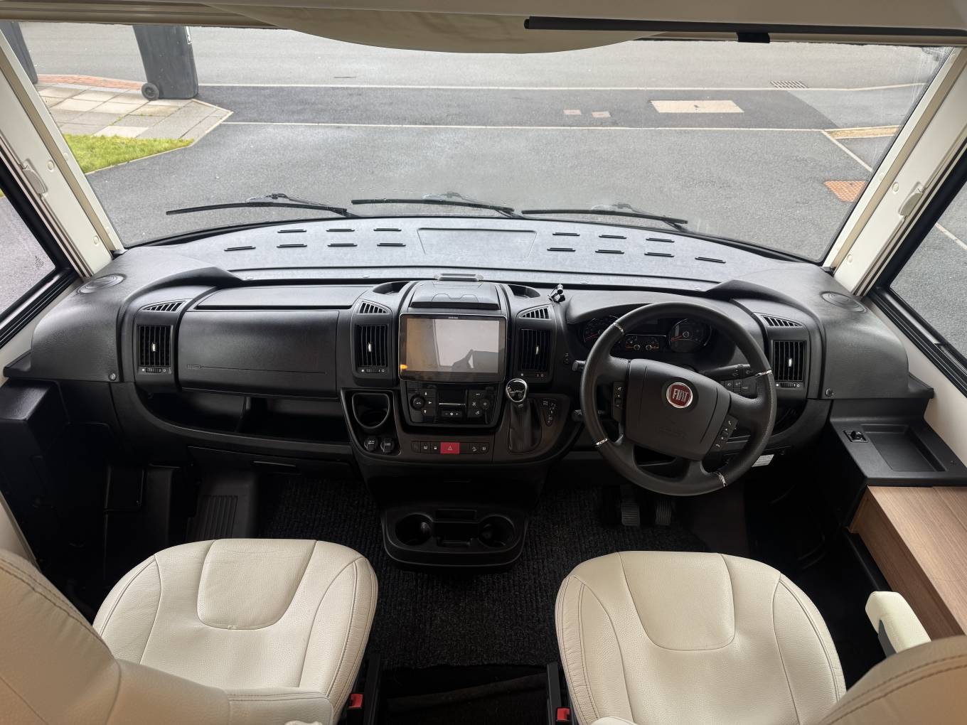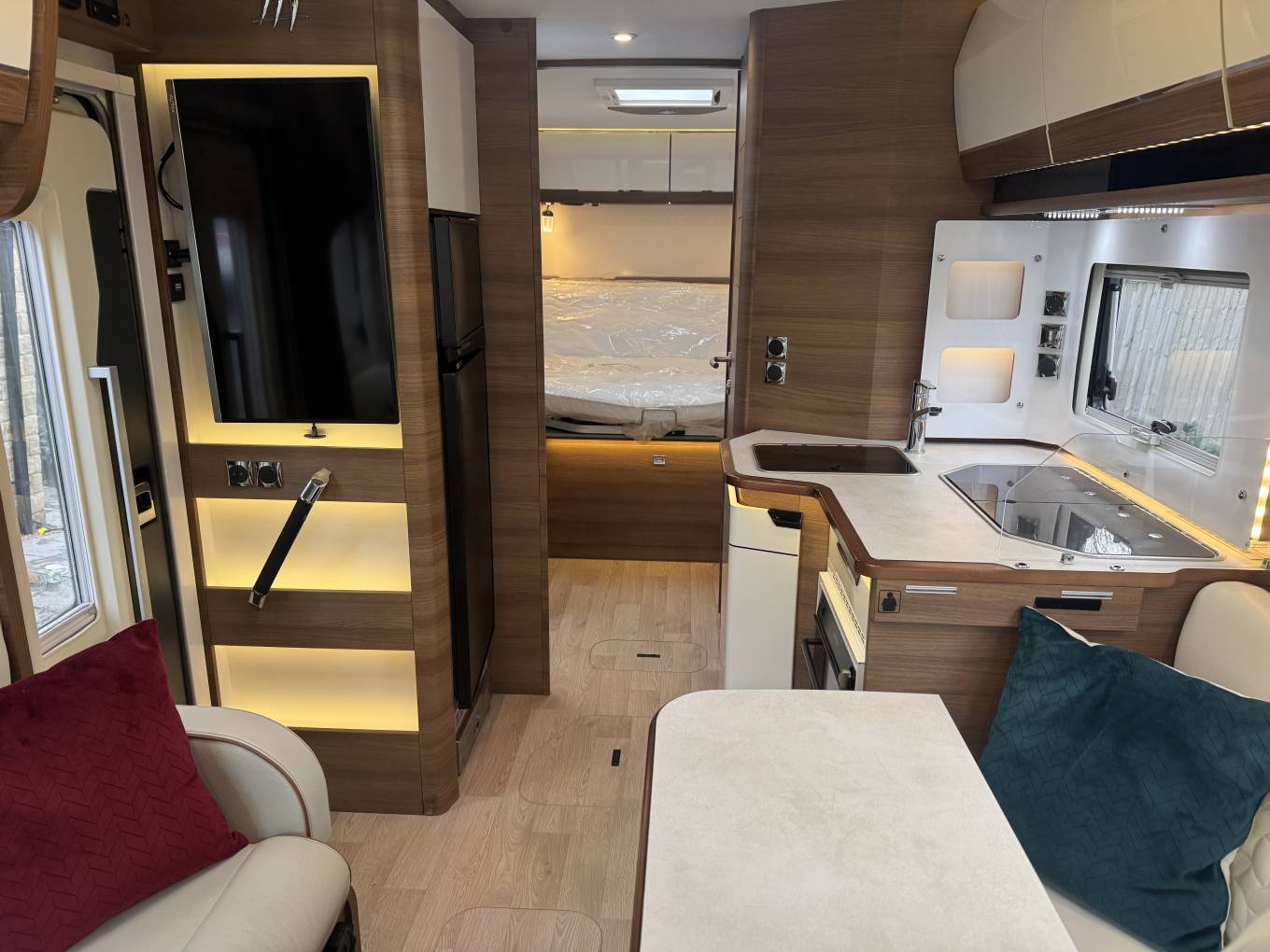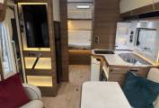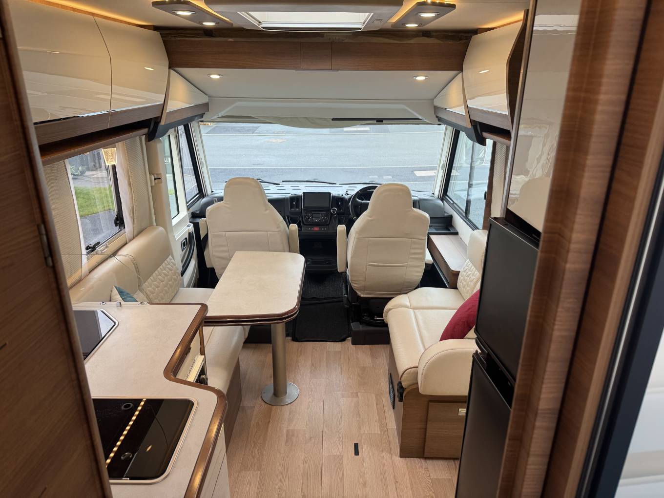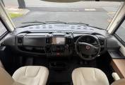 In the cab, the vehicle has an automatic gearbox, a touchscreen interface which includes apple/android play, bluetooth phone, radio, reversing camera and satellite navigation. There is also air conditioning along with electric windows and mirrors. Externally there is a wind out awning to allow al fresco dining, Shower point along with external storage lockers including the enormous garage.
