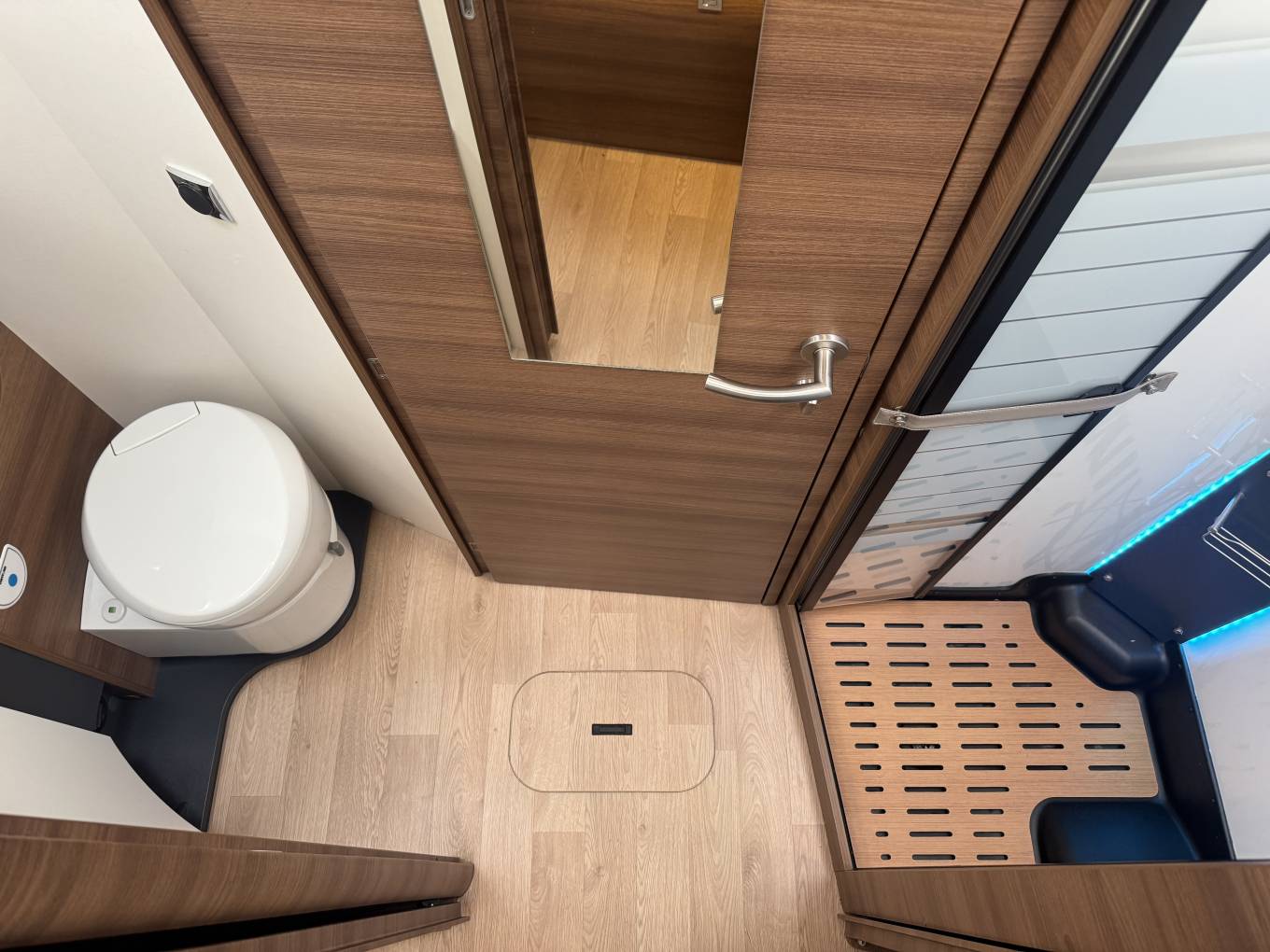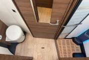Moving through to the centre of the motorhome, there is a large washroom which includes a full length shower on one side and a wash basin with mixer tap, cupboards and a separate Thetford toilet with further storage units opposite. This area can be closed off from both the bedroom and living area.