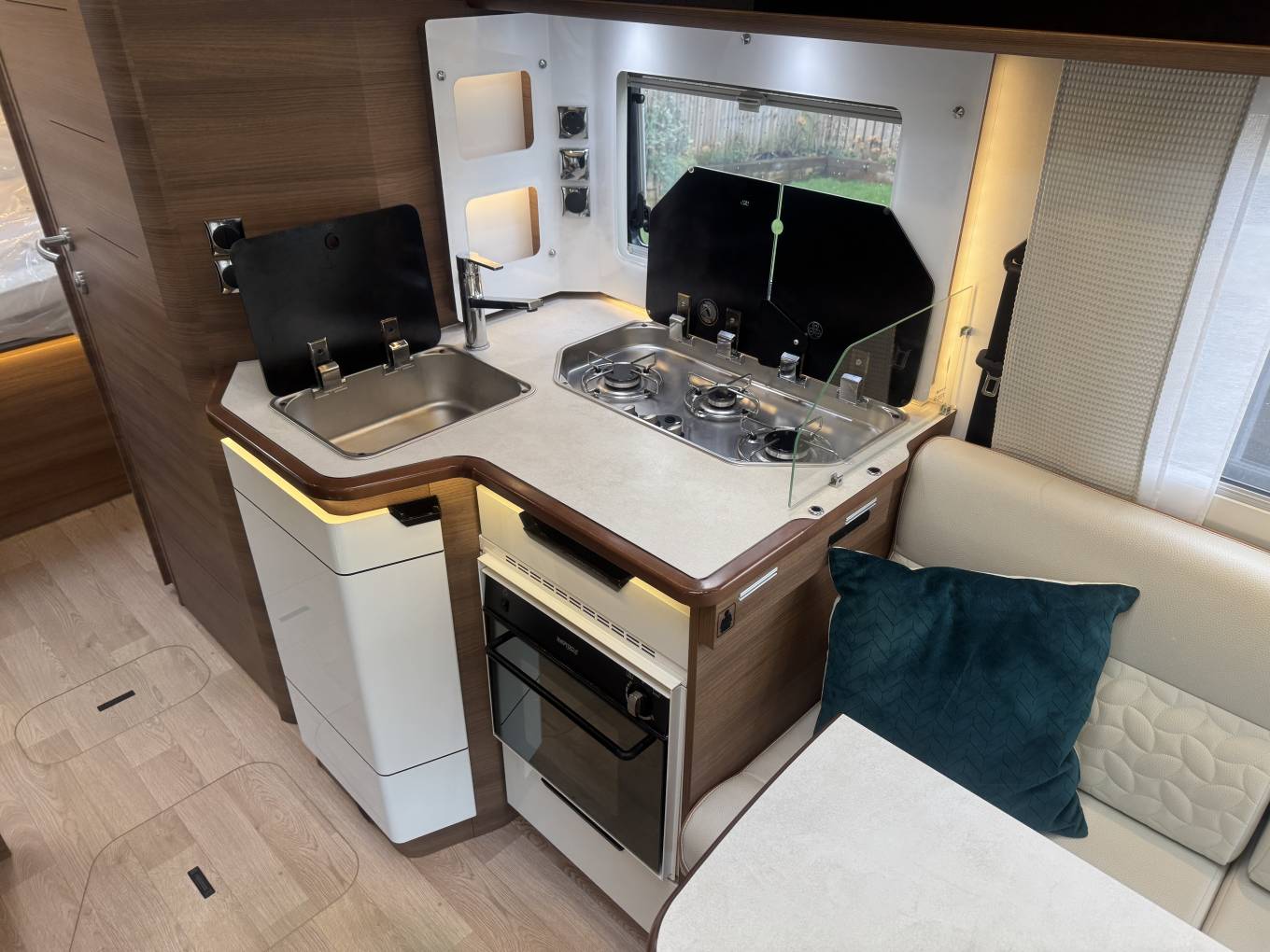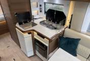 Carrying on through the motorhome, we come to the kitchen area where there is an oven along with a 3 ring gas hob supplied from the gas bottles the external storage locker. Next to the cooker is the sink with mixer tap and last but not least there is a large 3 way Dometic fridge with separate freezer compartment.