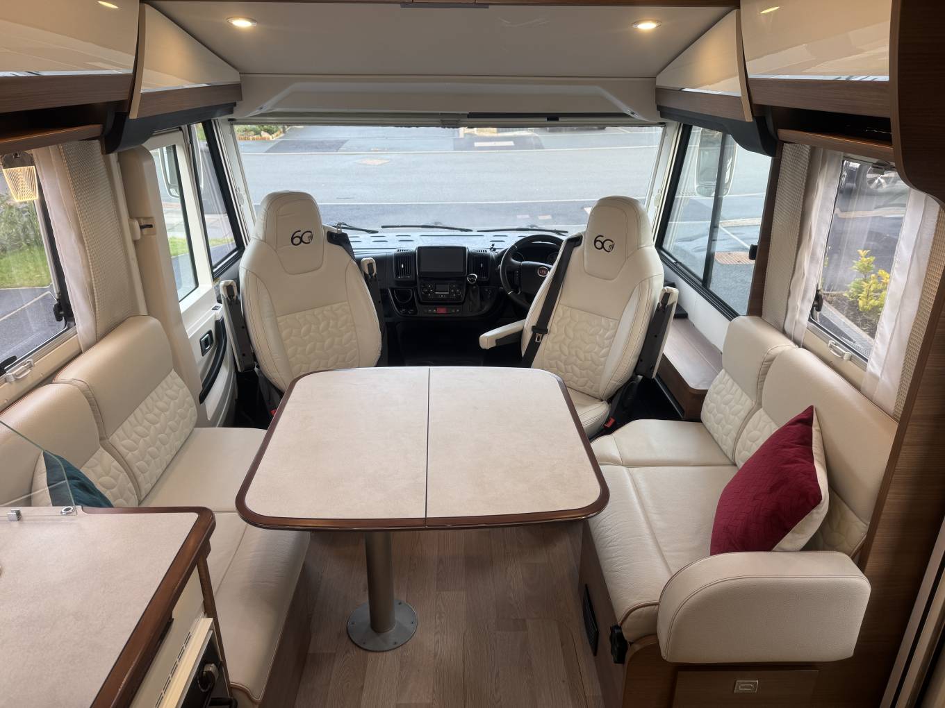 As we head towards the front of the motorhome, we come to the lounge/dining area where there are the rear two travelling seats that come up from the sofa on each side of the motorhome along with the driver and passenger seats that both swivel to face the large heated dining table which is positioned in between which offers that warm family dining experience. Above the cab is the large drop down bed that can easily accommodate two adults.