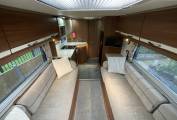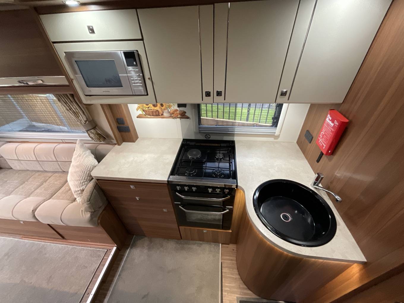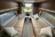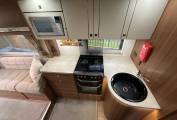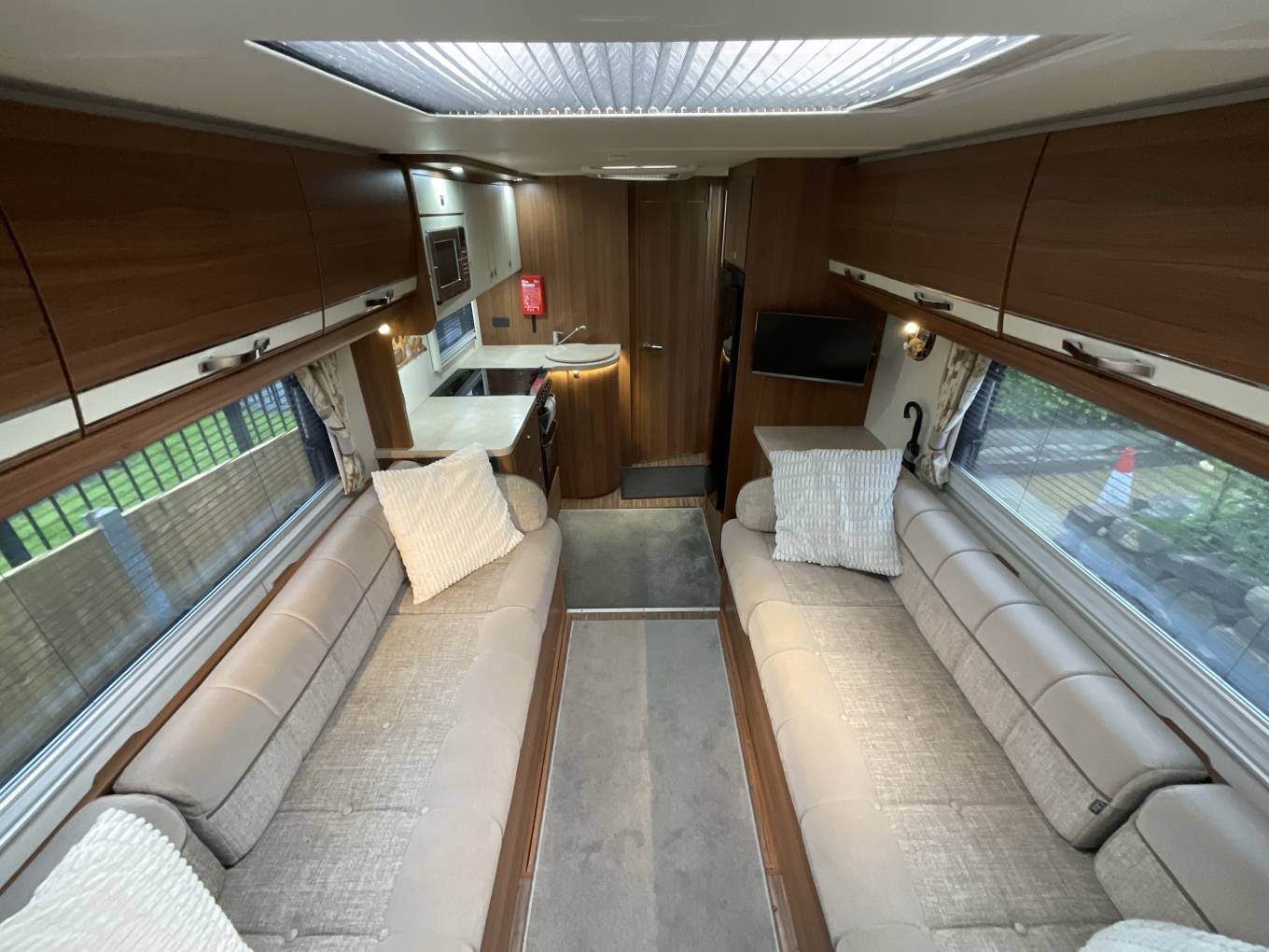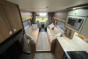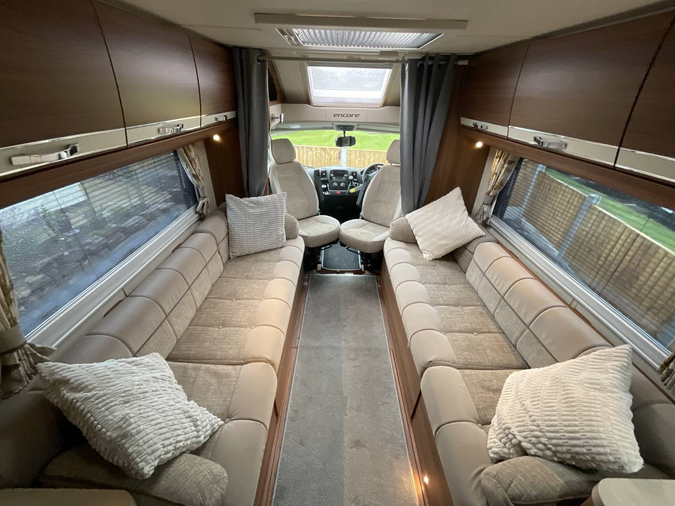 The interior features a spacious and welcoming front lounge with comfortable seating, creating a bright and relaxing living space. This area easily converts into a generous double bed, providing a cosy and practical sleeping arrangement. The kitchen is fully equipped with ample storage, worktop space, hob, oven and fridge freezer, allowing you to prepare meals with ease while on your travels.
