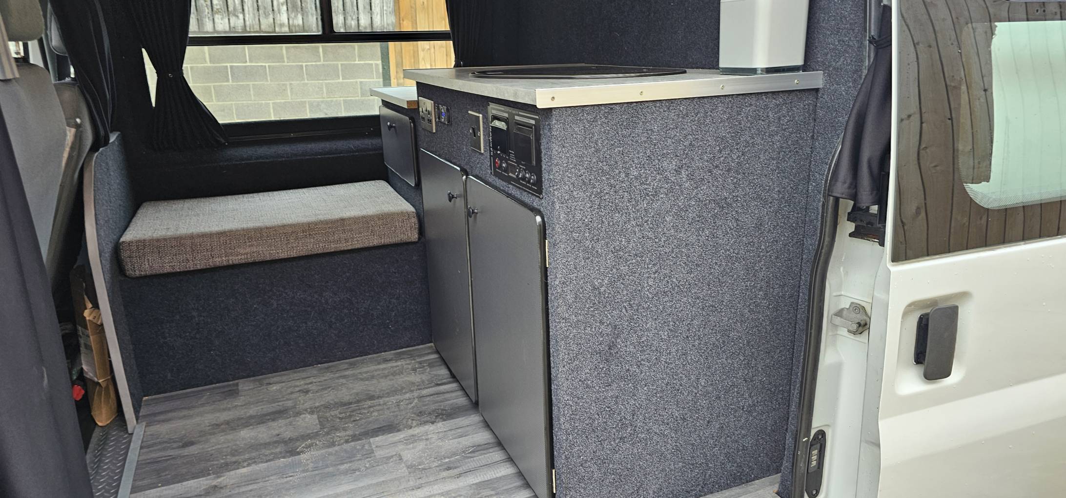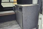 Transverse kitchen with sink/hob and under storage for gas bottle and water containers