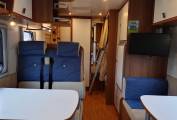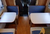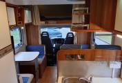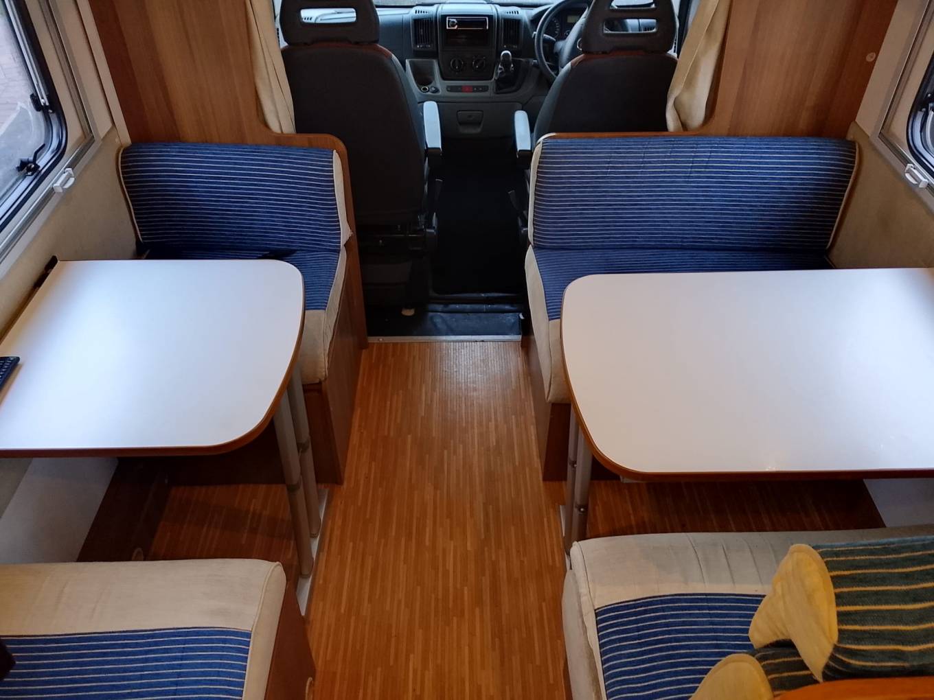 The lounge can seat 6 diners with ease and is separated as 2 areas each with their own dining table. These tables convert quickly into a small double and standard single bed for additional sleeping if required. To the front is a huge double bed over the cab making the sleeping capacity 7 in total. There are 4 x 3 point seatbelts on board with 3 lap belts to the rear facing seats.