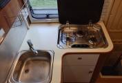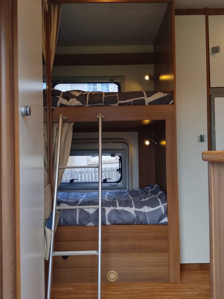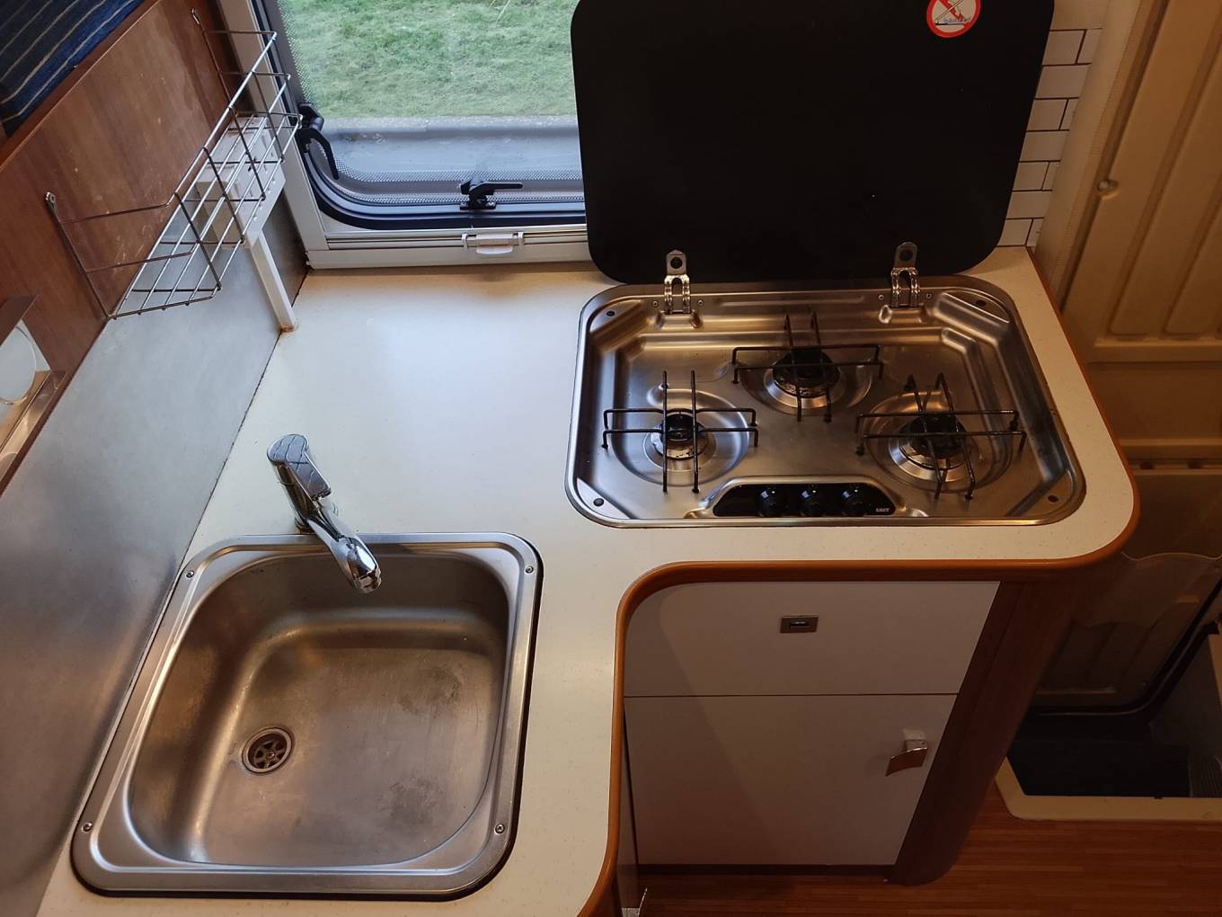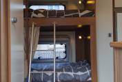 The layout is as you enter the accommodation there is a good sized cupboard on your left with a boot locker conveniently placed underneath. The washroom is located at the rear and of generous proportions with a separate shower, cassette toilet and hand washbasin. Also at the rear are twin bunk beds with opening windows and lighting. The kitchen is L-shaped and has ample storage, a gas hob, sink and raised fridge with freezer compartment for easy access with a full sized wardrobe and additional cupboard space either side of the fridge.