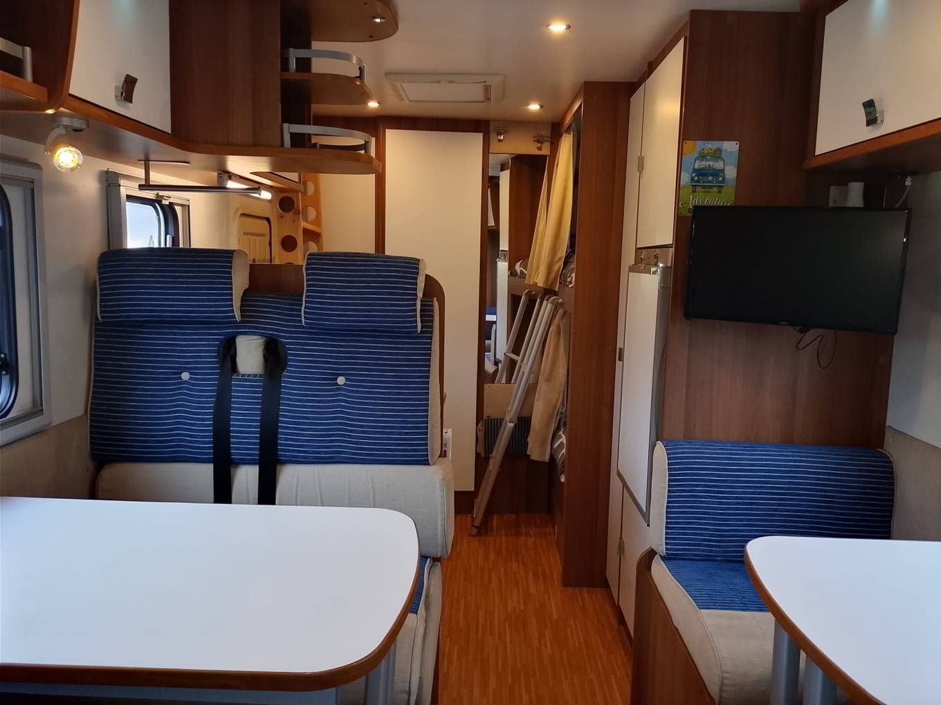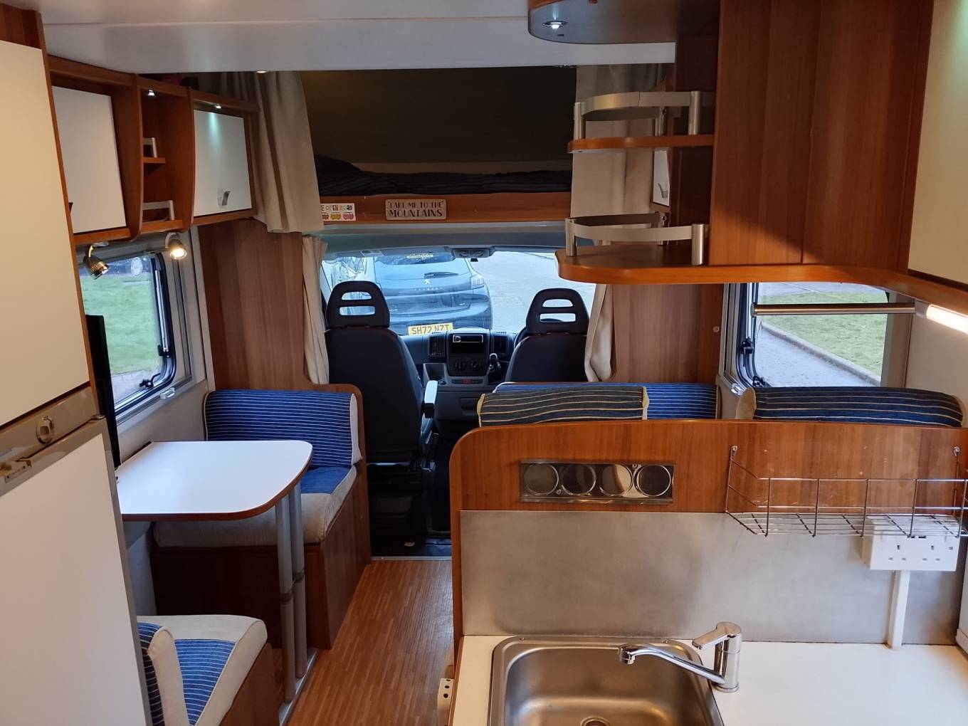 The motorhome is fitted with a solar panel, LED internal lighting, TV with Freeview, Milenco extra door locks, Visionplus aerial, bike rack, a gaslow LPG system with an additional propane gas bottle should you wish to use and a garage to the rear which can be trebled in size if you don’t require the lower bunk. The garage at its largest can take bikes, sports equipment and holiday provisions with easy access form the large external hatch door.
