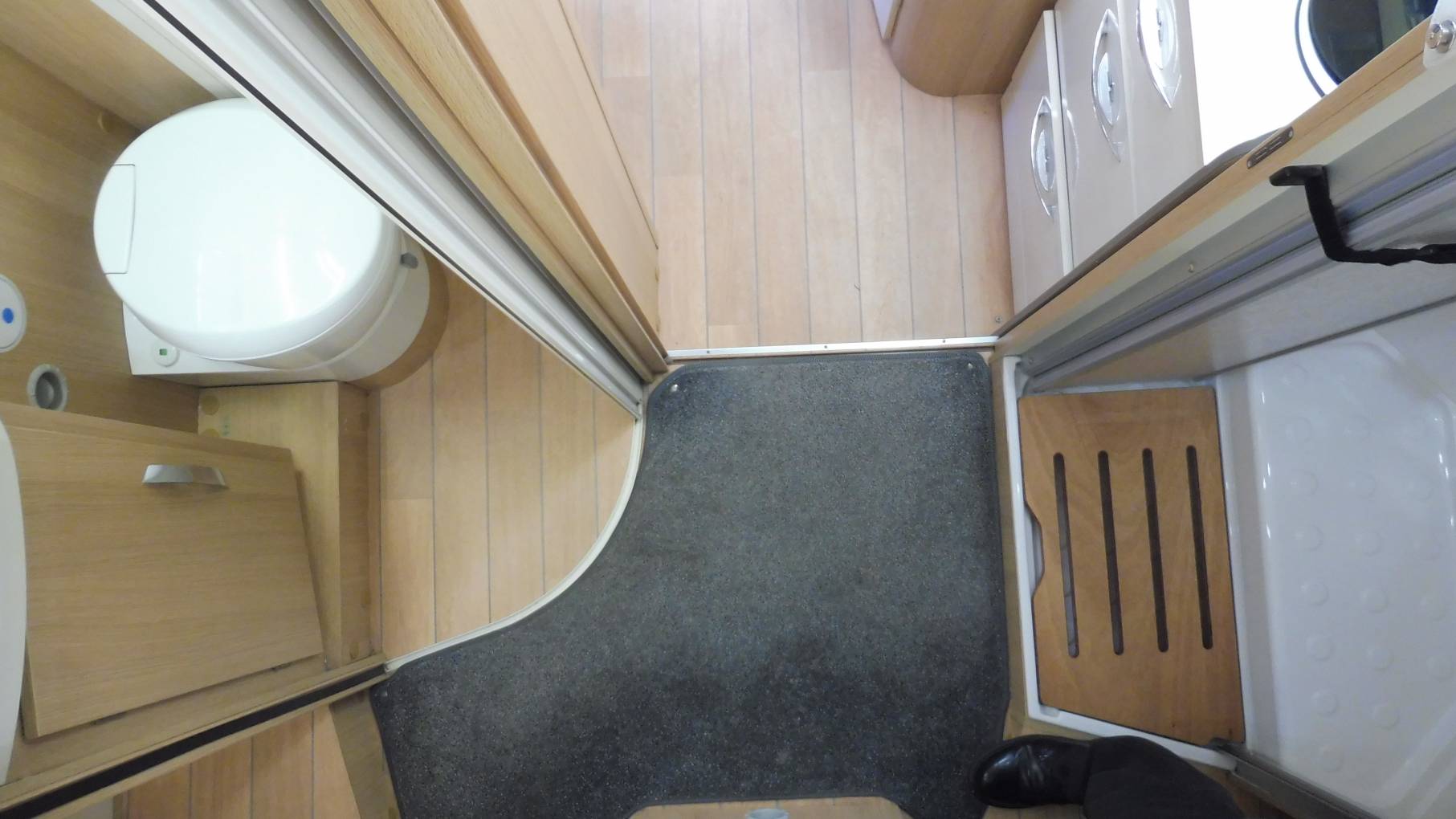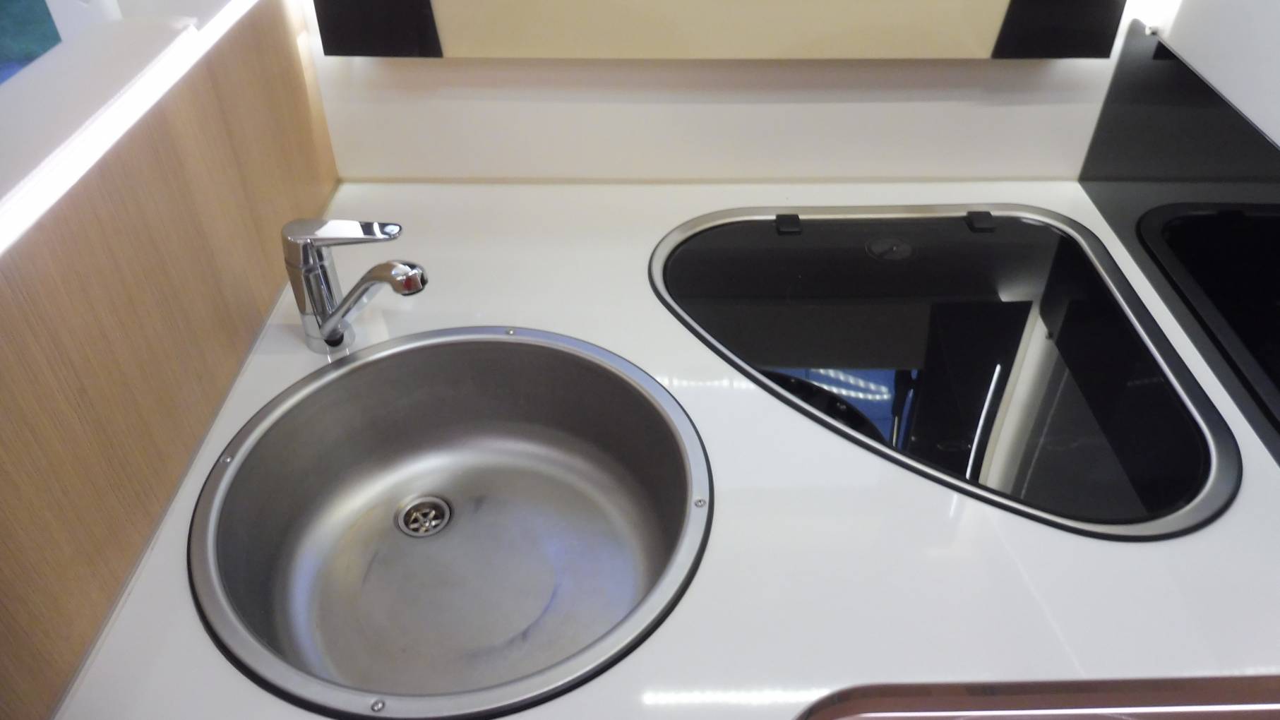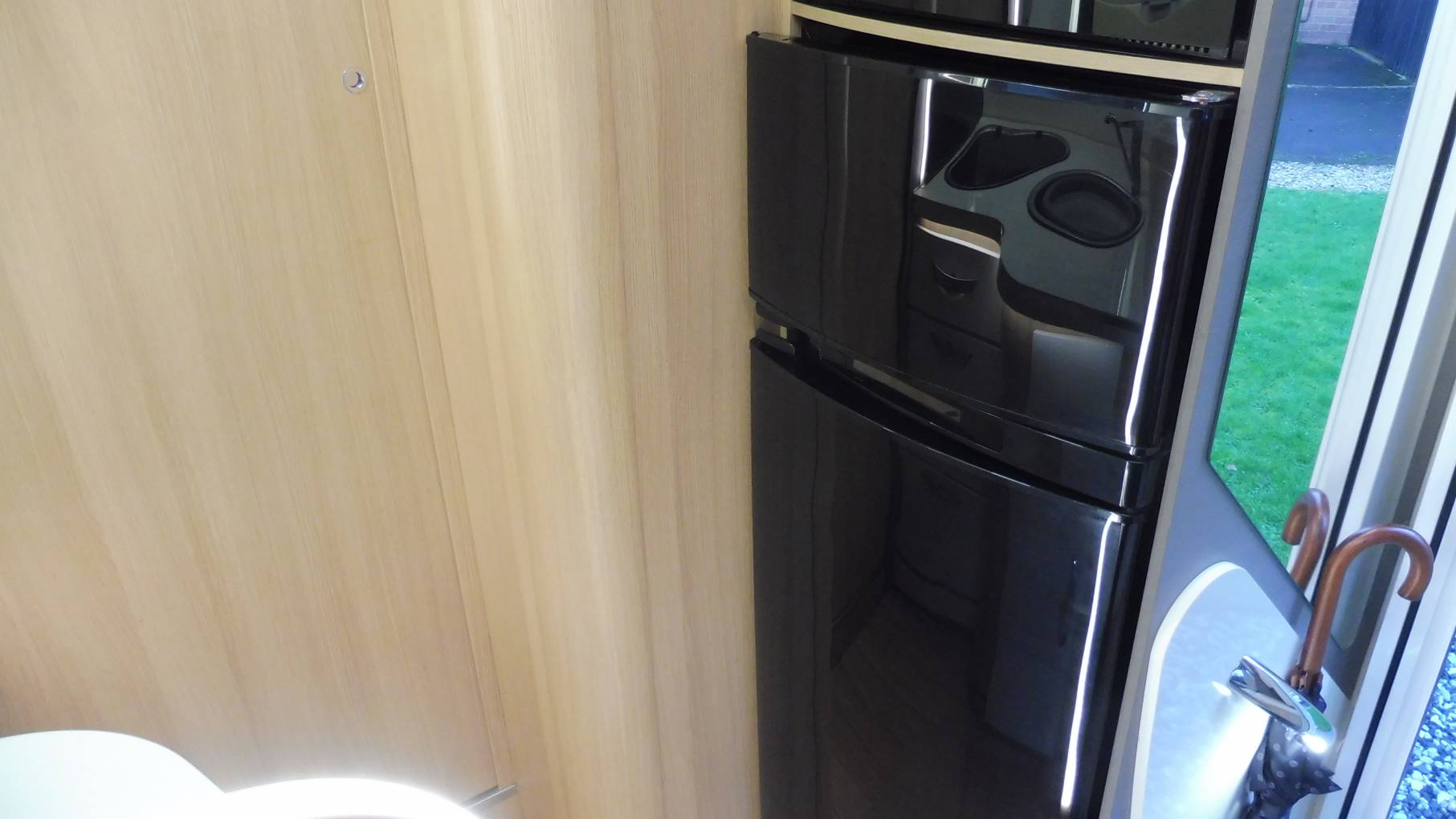 Moving rearwards you have an extremely well-equipped kitchen featuring oven-grill combi, gas hob, large 3-way fridge, separate freezer, sink with mixer tap.
