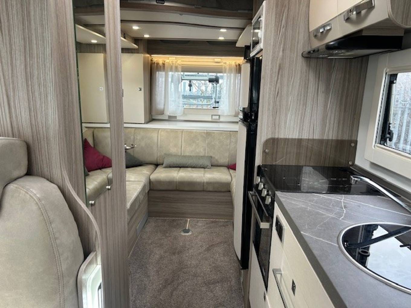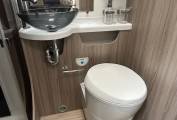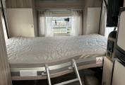 Sleeping arrangements are both practical and flexible, with two drop-down double beds, one over the rear lounge and one above the dinette—allowing you to maximise daytime space without compromising on night-time comfort. The well-appointed kitchen is equipped with a Thetford Triplex oven and grill, fridge/freezer, microwave, and extractor fan, while the modern washroom offers a shower, Thetford toilet, and wash basin, providing full onboard convenience.