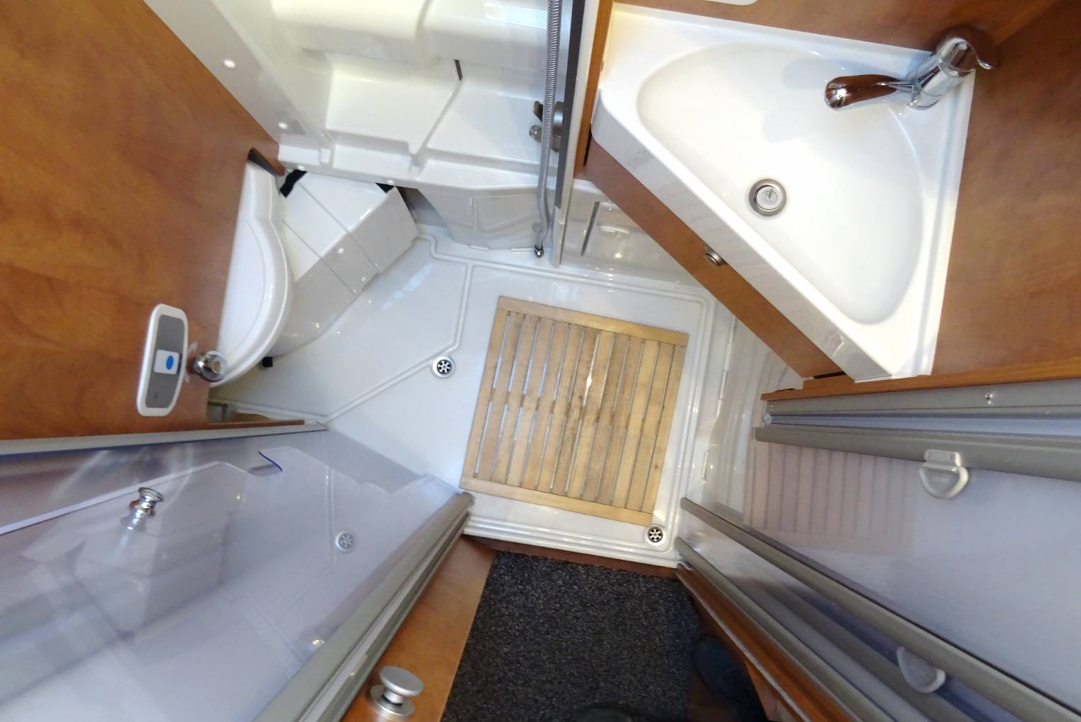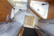 flush can be retracted into the bulkhead whilst the shower is in use. The white corner sink unit has a