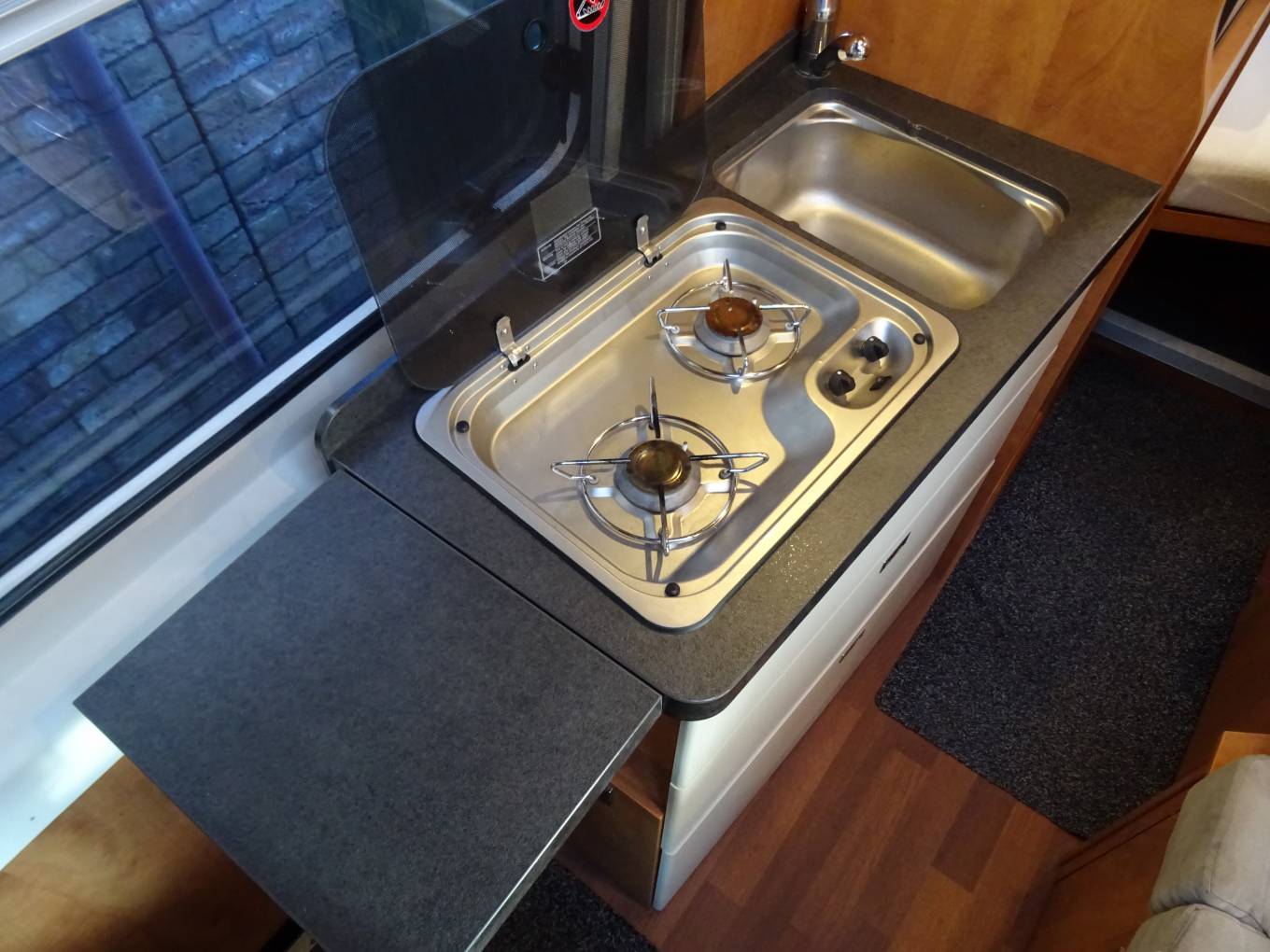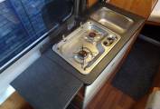 Mid ship we have the kitchen area with a 2 ring gas hob, sink