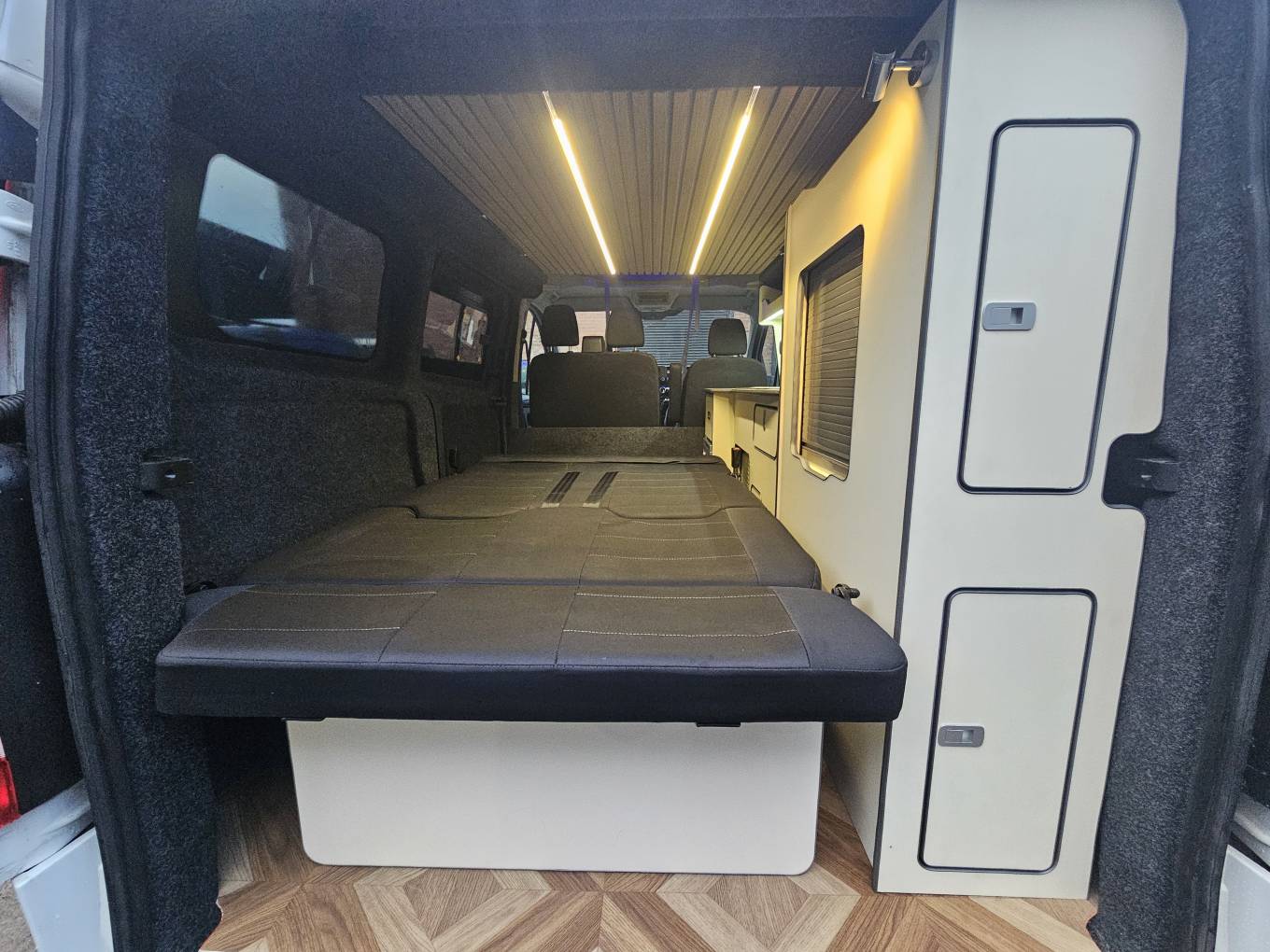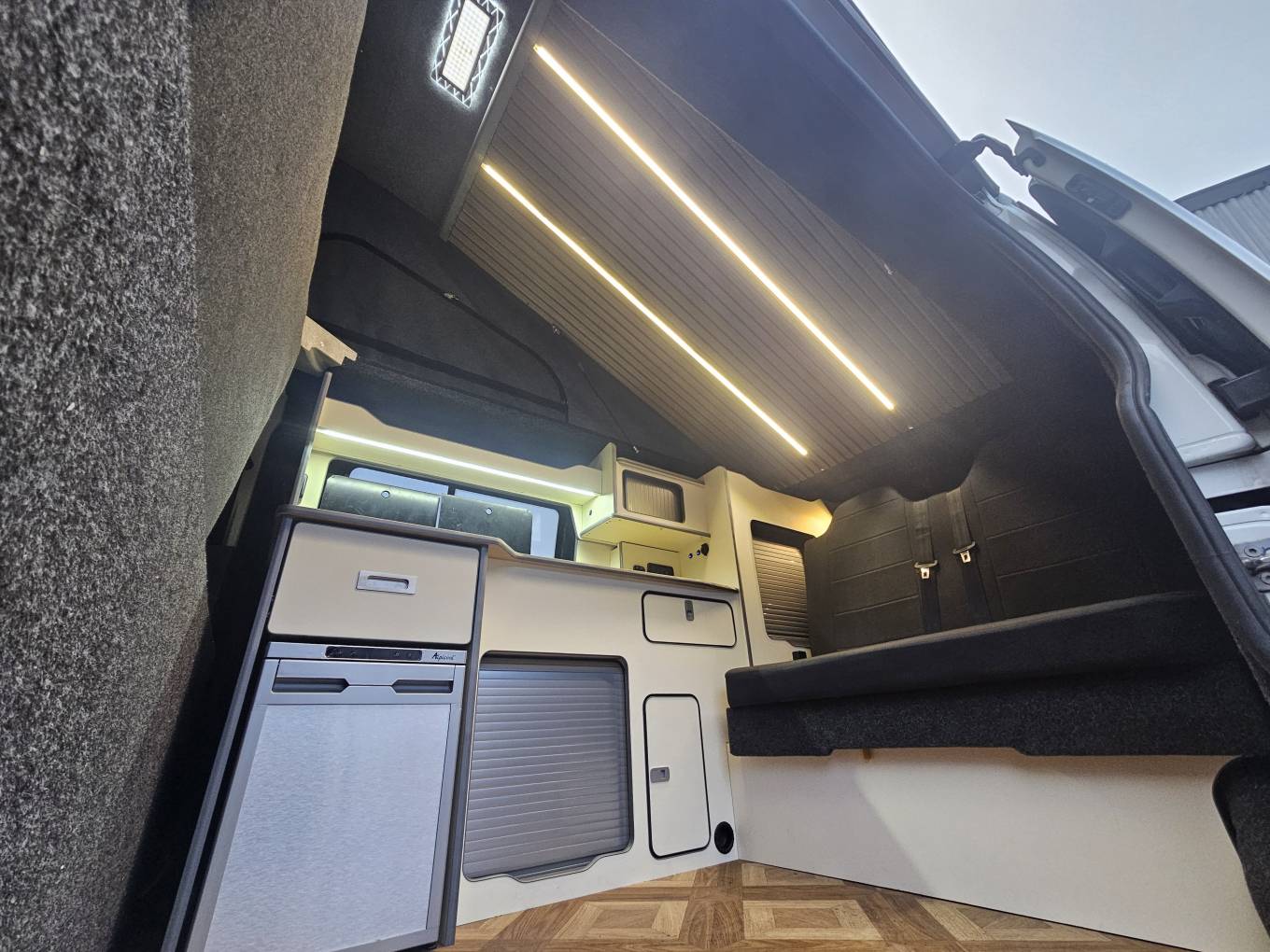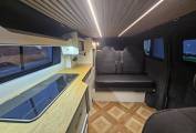 Weighing approximately 2,800kg and measuring just 4.97 metres in length, this compact yet practical layout makes it easy to drive and suitable for everyday use as well as extended trips. The newly completed conversion includes an M1 tested rear rock and roll bed and a pop top roof with a hydraulic lift bed and scenic zip out canvas. The side kitchen is fitted with a combination sink and hob, 12V compressor fridge, fresh and waste water barrels, and a certified LPG gas system. Blackout curtains and a cab divider provide privacy and insulation.