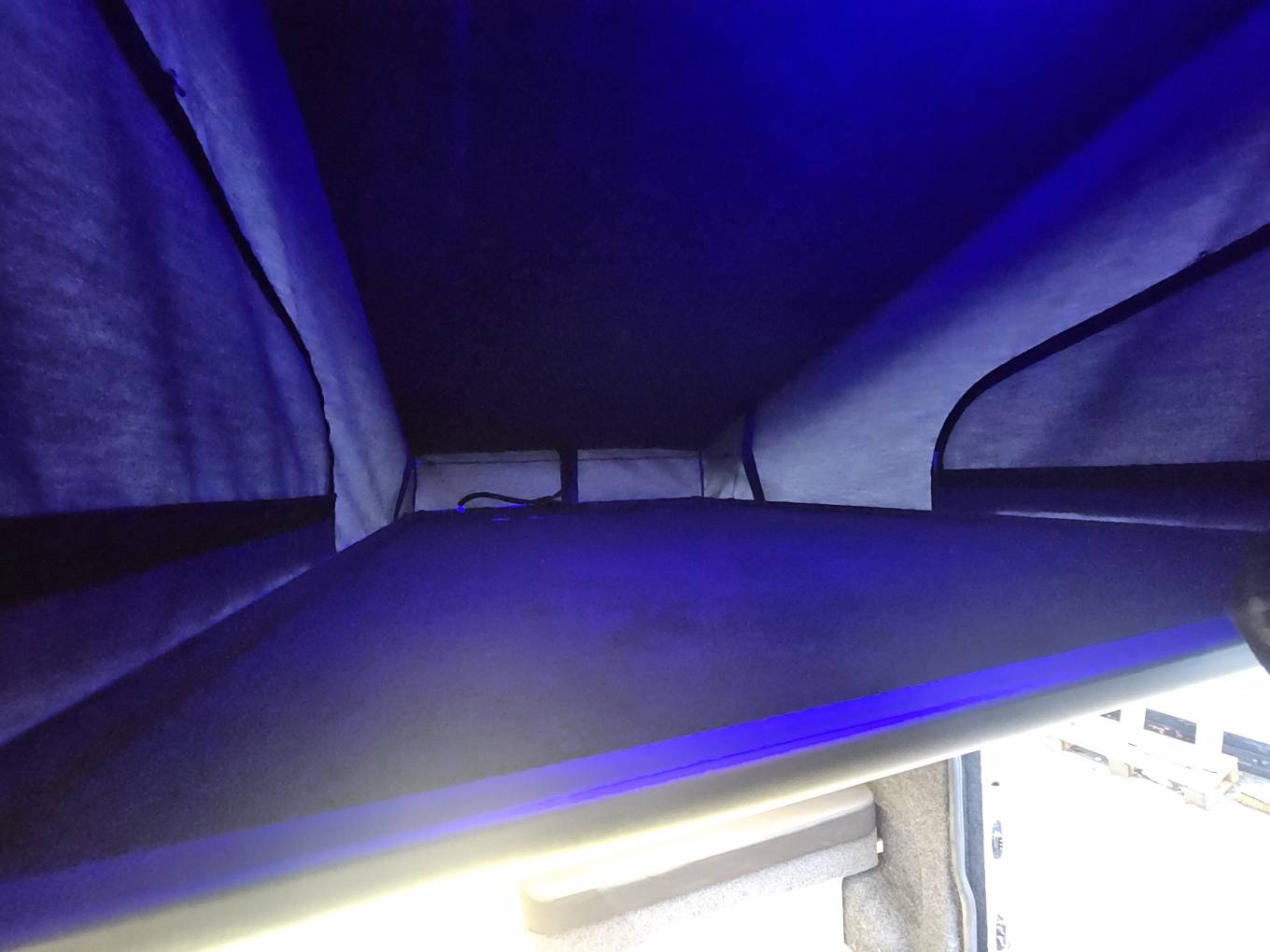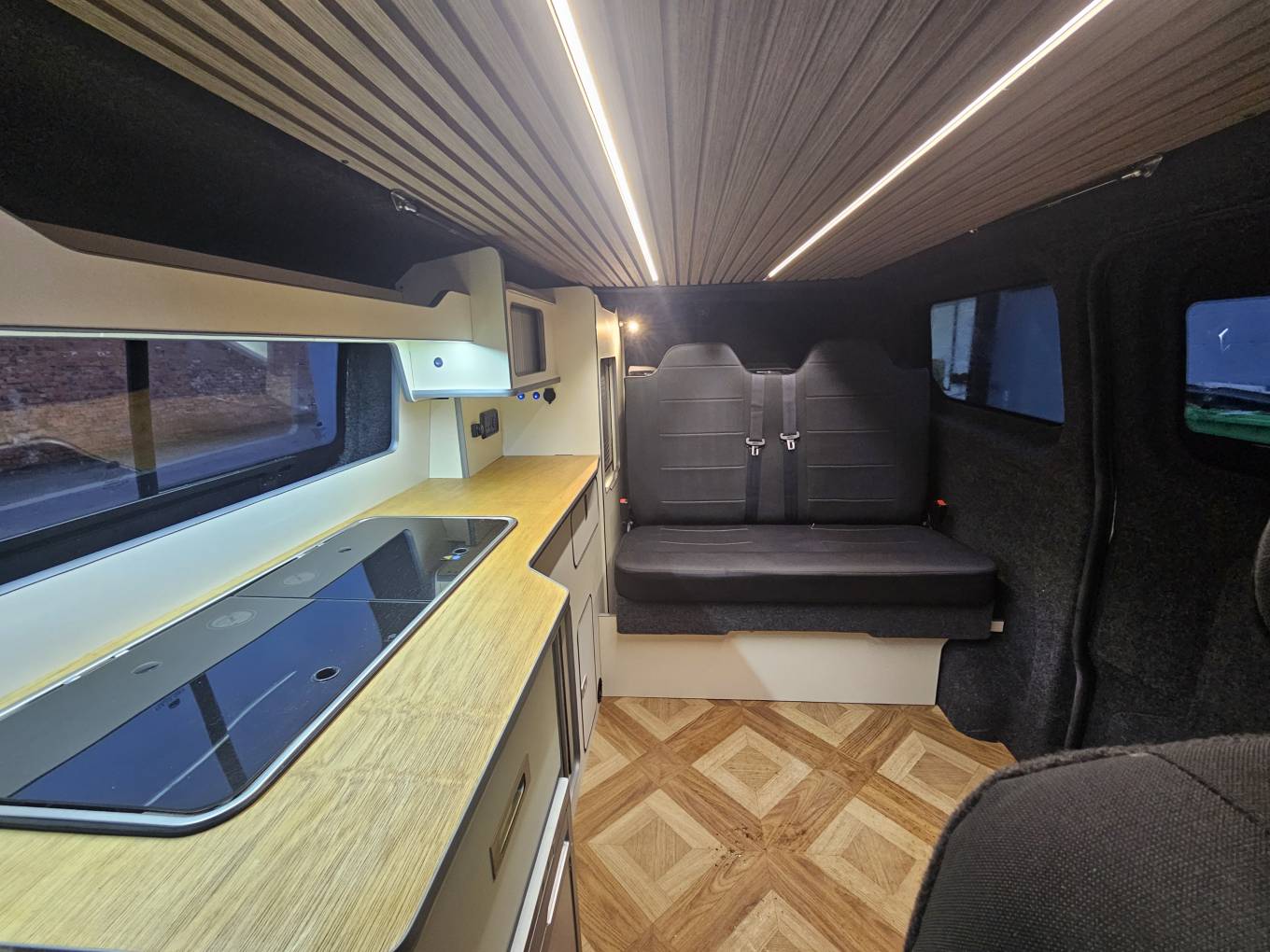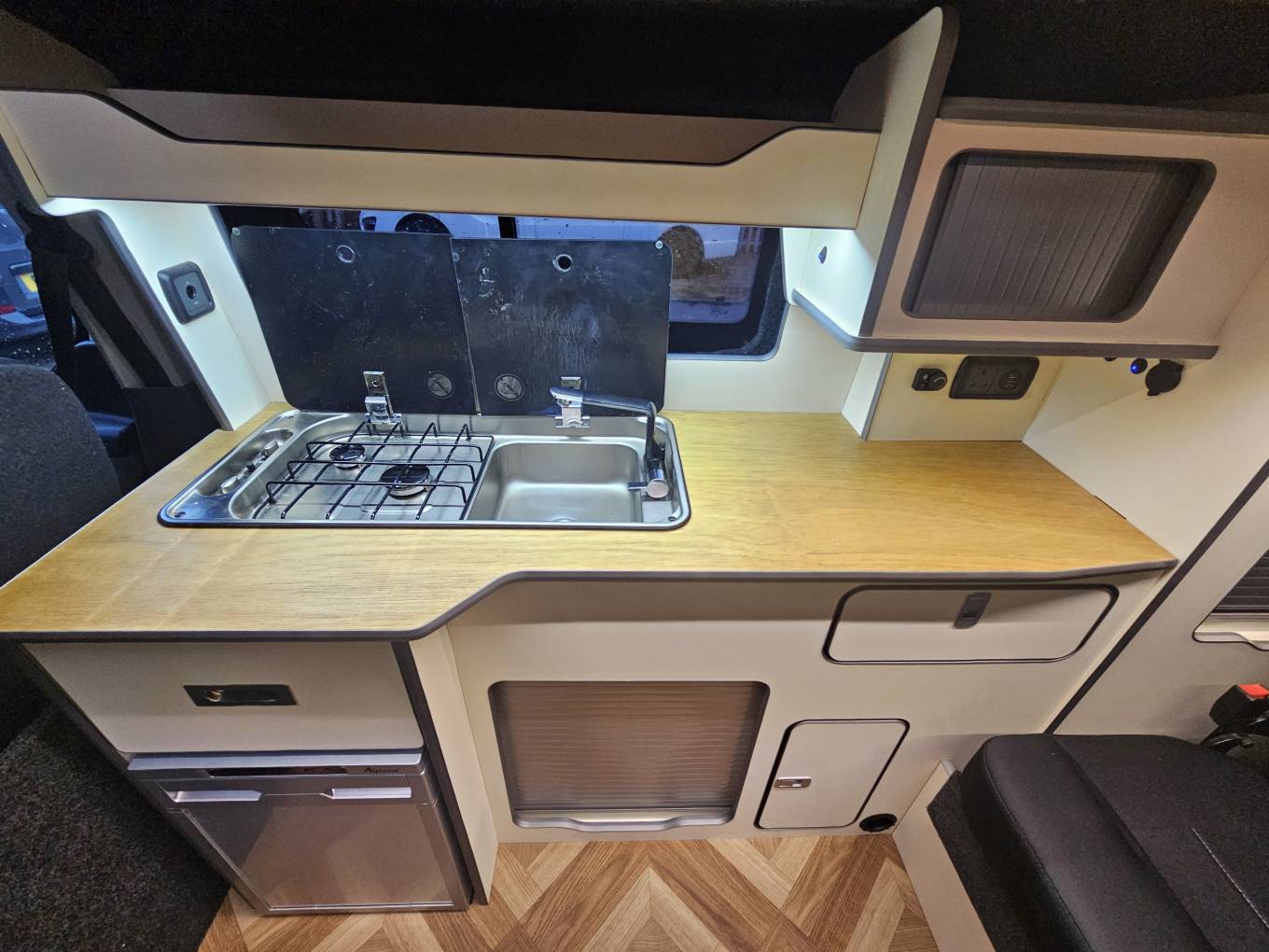 Designed for full off grid use, the camper is equipped with a 105Ah Fogstar lithium battery, 150W solar panel, Victron Smart MPPT 75/15 controller, Victron DC-DC 18A charger, and Victron IP22 230V/12V mains charger all with Bluetooth connectivity via the Victron app. The power system is supported by a 230V FAP hook-up inlet, double pole MCB RCD, LED lighting, 12V and 230V sockets, and both USB and USB-C charge points throughout.
