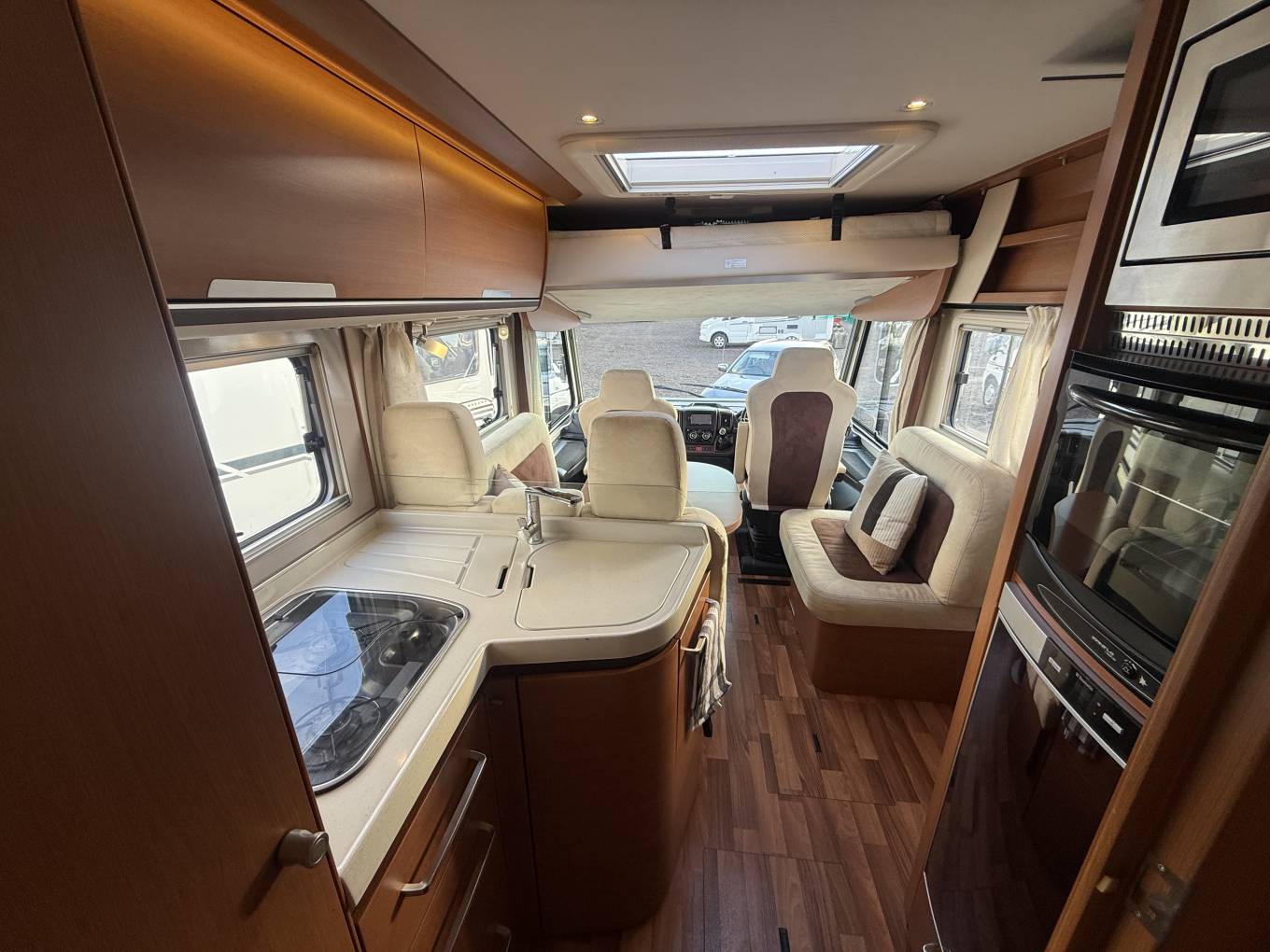 The layout of this luxurious motorhome is as you enter the motorhome you get a real feeling for the luxury and High quality build this motorhome exudes. At the front of the van there is a large seating area finished in cream and chocolate suede and with the 2 captain’s chairs it easily seats 6. The modern kitchen area comprises a three ring gas hob, separate oven and grill, high quality food preparation worktops and sink, mixer tap, microwave, and fridge with freezer compartment. There is plenty of storage and cupboard space throughout.