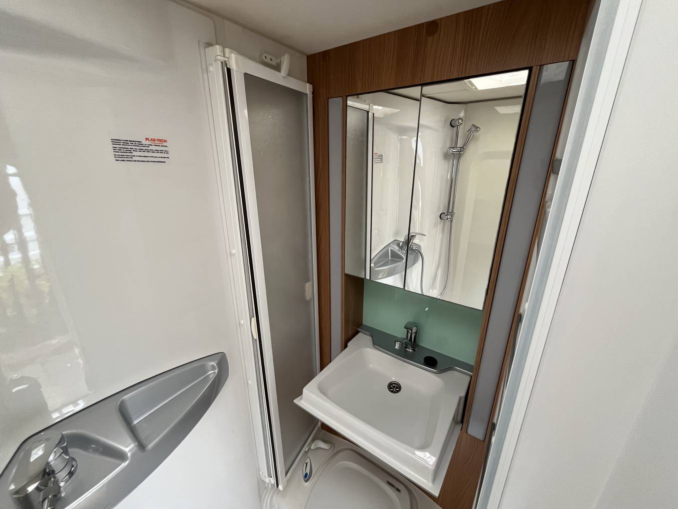 - Washroom with pull-down hand wash basin, integrated shower tray and Thetford cassette toilet