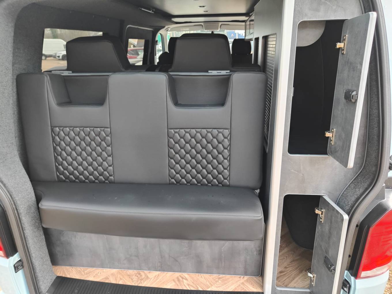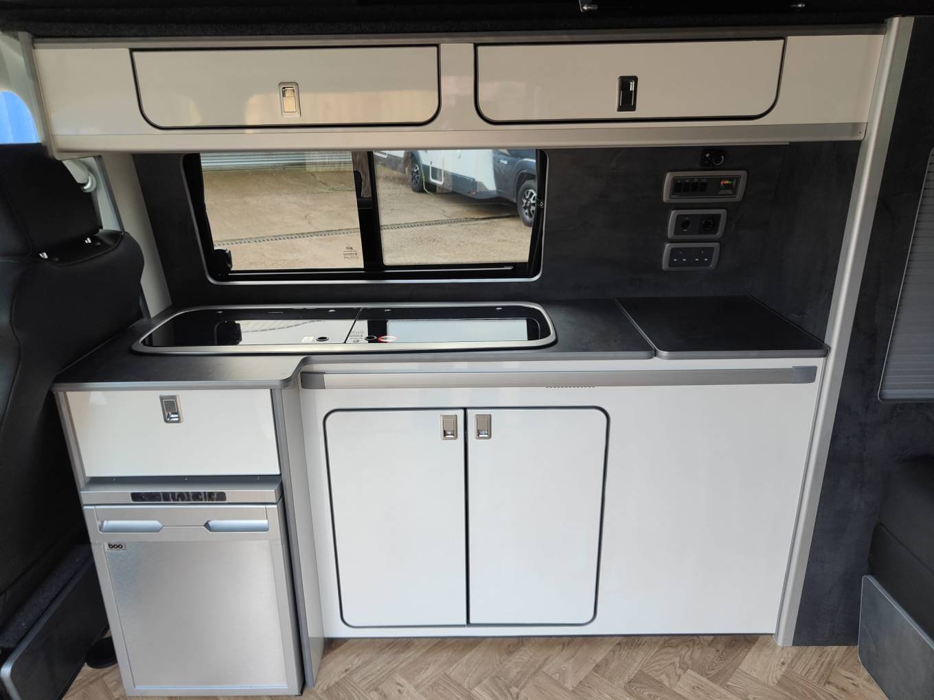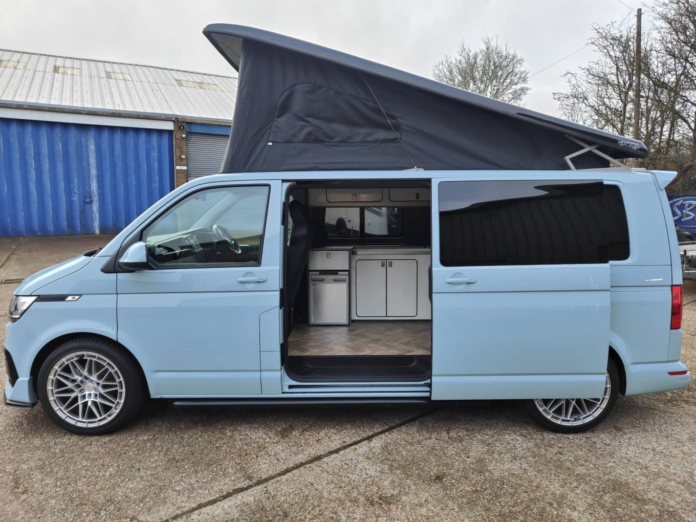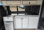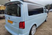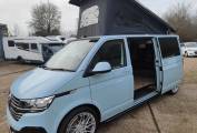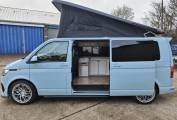 An AS NEW example of the extremely popular VW T28 camper with an elevating roof. This 4 berth, 4 seatbelt model features a very easily made Rock and roll style seat that drops down for one double with a large roof bed that is also a generous double. With a side kitchen that has a fridge, 2 burner hob, sink and a diesel heater, this unused camper is like buying a used camper but getting a new one. 745 miles and never slept in nor kitchen used. Leather style seating and great looking alloy wheels. Based in Kent and more pictures available.