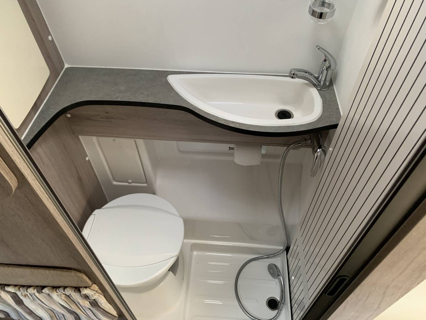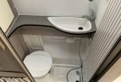 The washroom behind the kitchen has a Thetford electric flush toilet, wash basin and shower attachment.