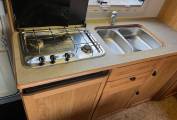 The Kitchen Area has a 3 Way Fridge Freezer, Hob, Sink plus Storage.