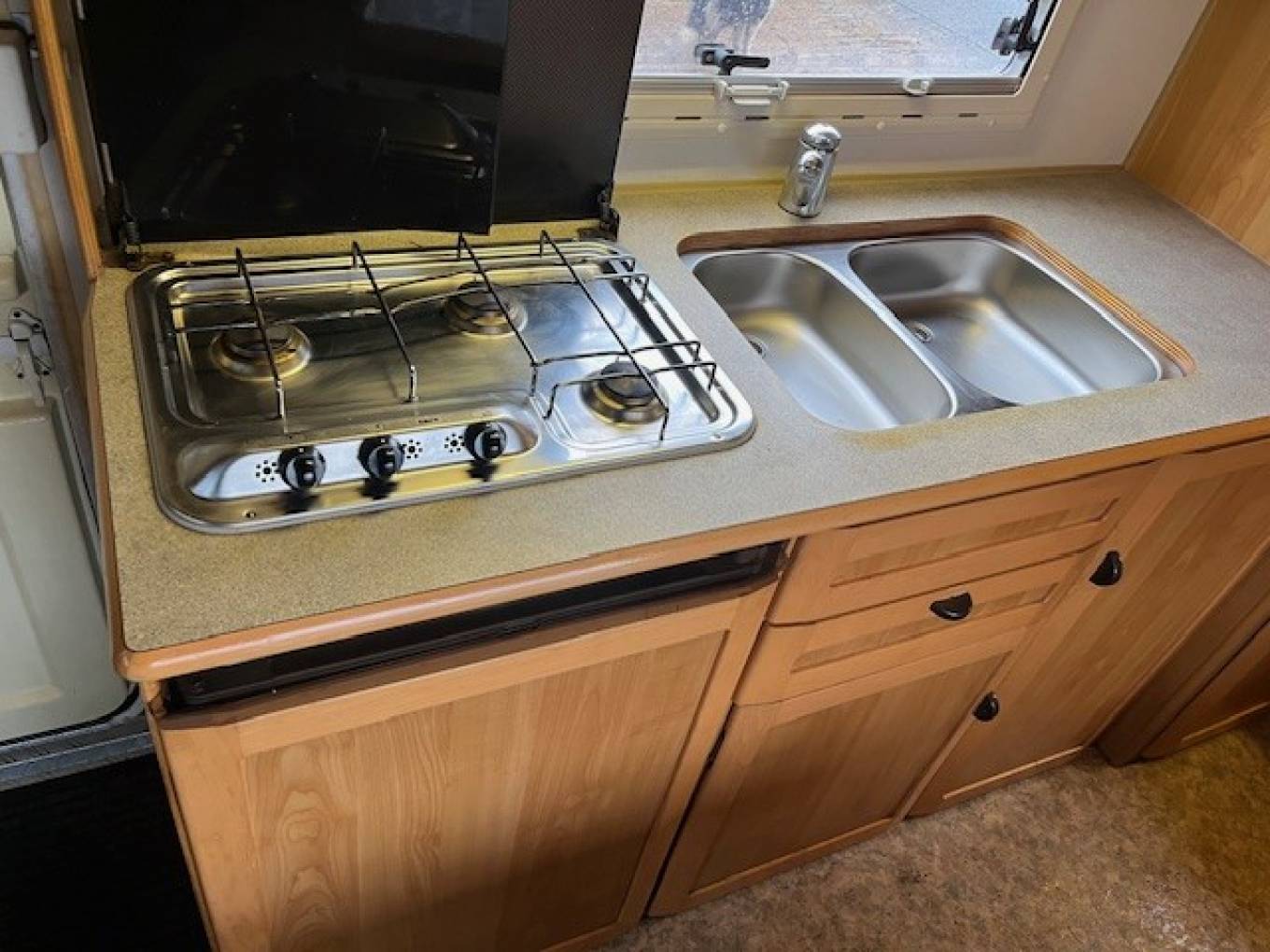 Spec includes, Rear Garage Space, 4 Travelling Seat Belts plus 2 x Lap Belts, Bike Rack, Wind Out Awning, Solar Panel, Immobiliser, Radio, Gas Bottle, BBQ Point, Wardrobe, Fresh and Waste Water Tanks, Tow Bar, Blinds and Fly Screens, Table, Truma Gas Heating / Hot Water System, Hook Up Cable, Leisure Battery, other useful extras included