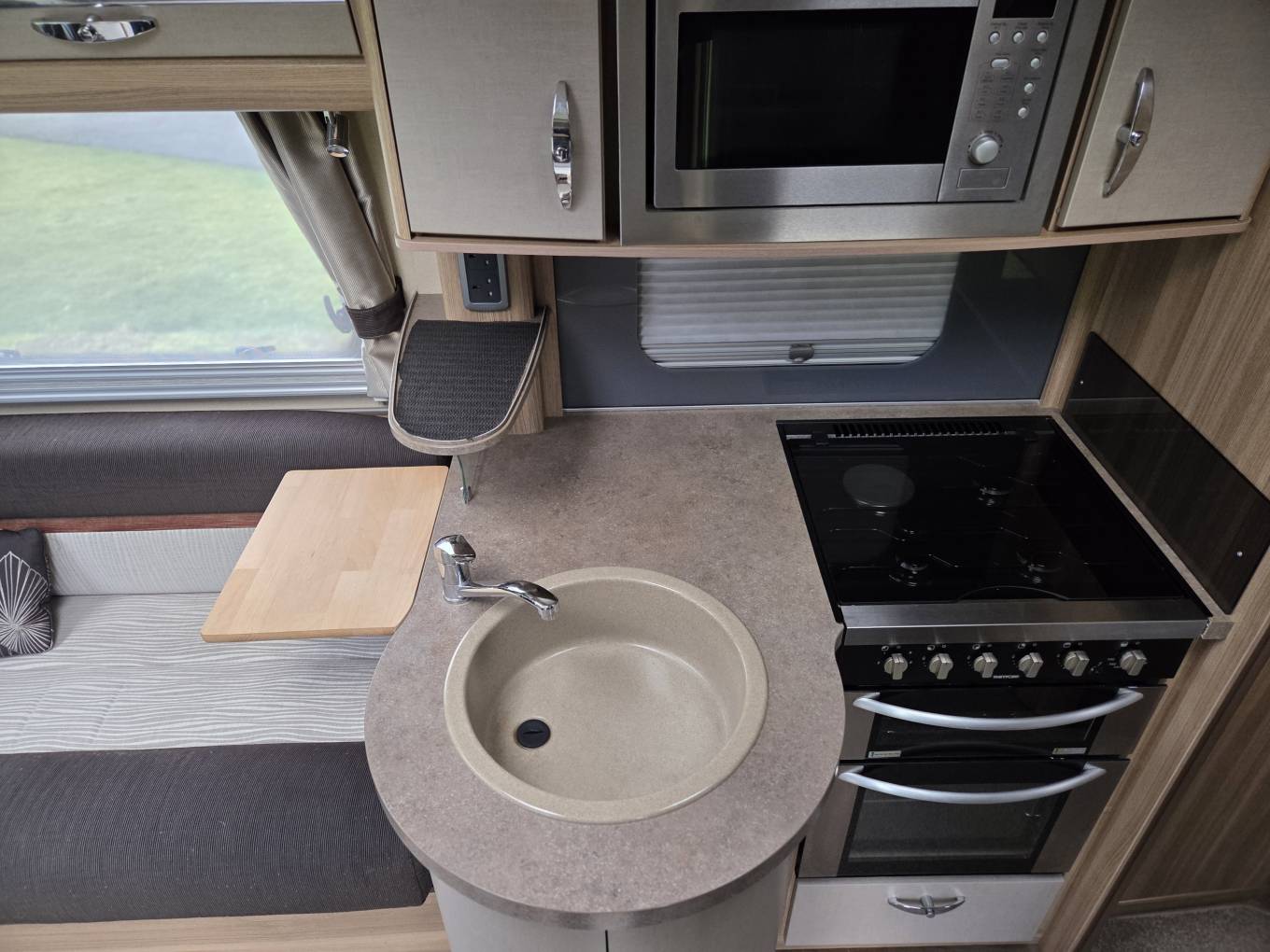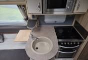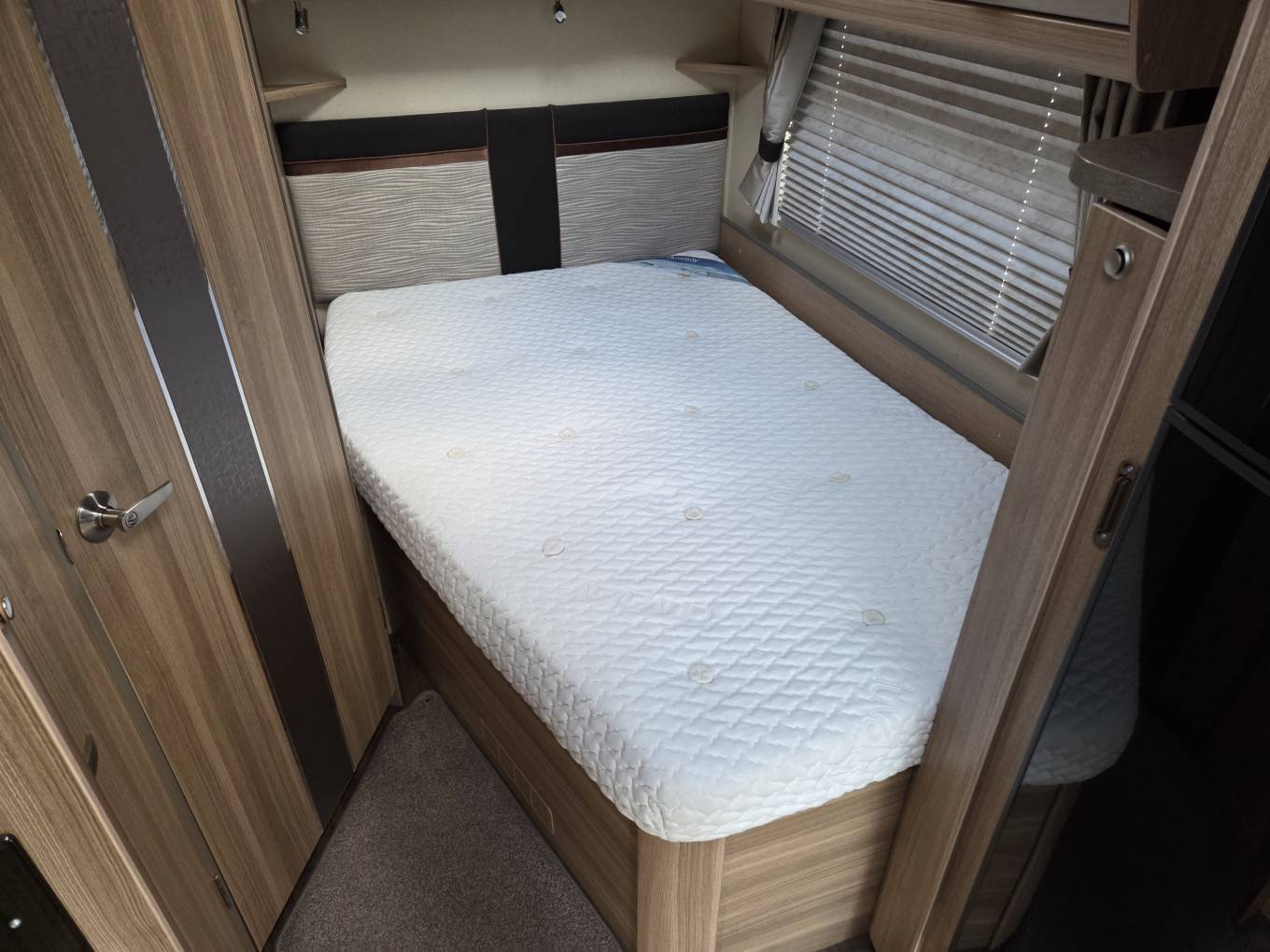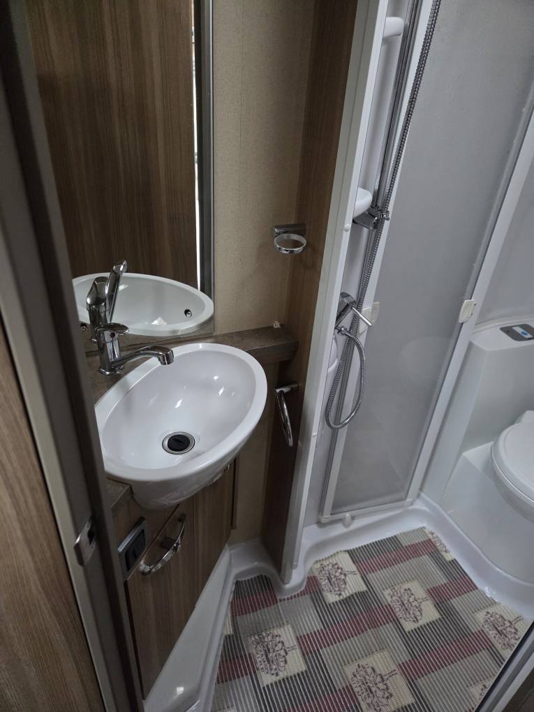 It has a full size French style bed at the rear with plenty of high level cupboard space and storage underneath. A TV point with adjustable bracket is fitted in the bedroom. Adjacent to this is the spacious washroom/toilet with vanity units and mirrors. A full height foldaway screen segregates and provides privacy for the rear bedroom and washroom area.