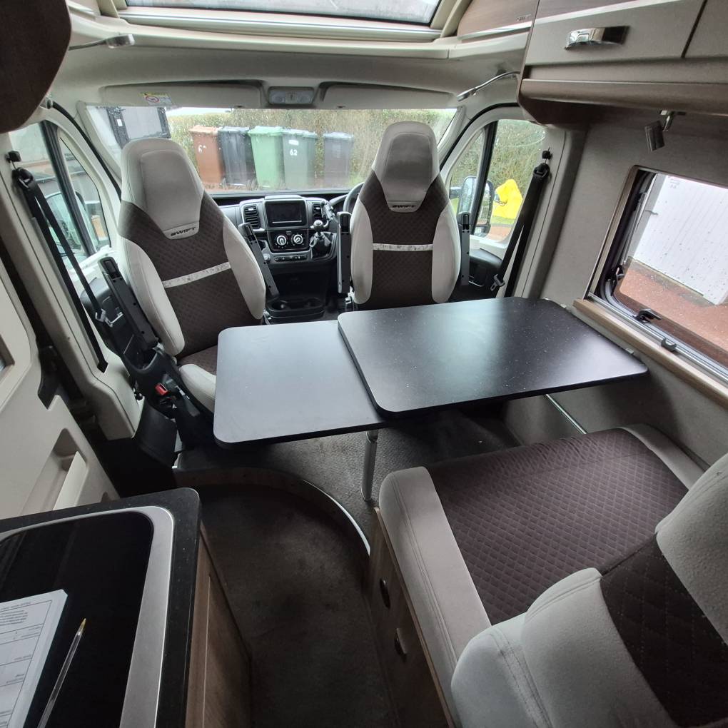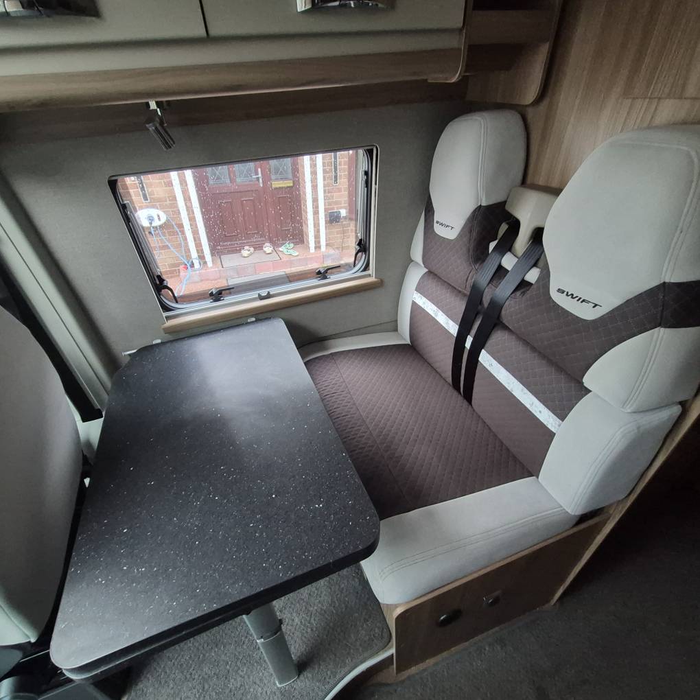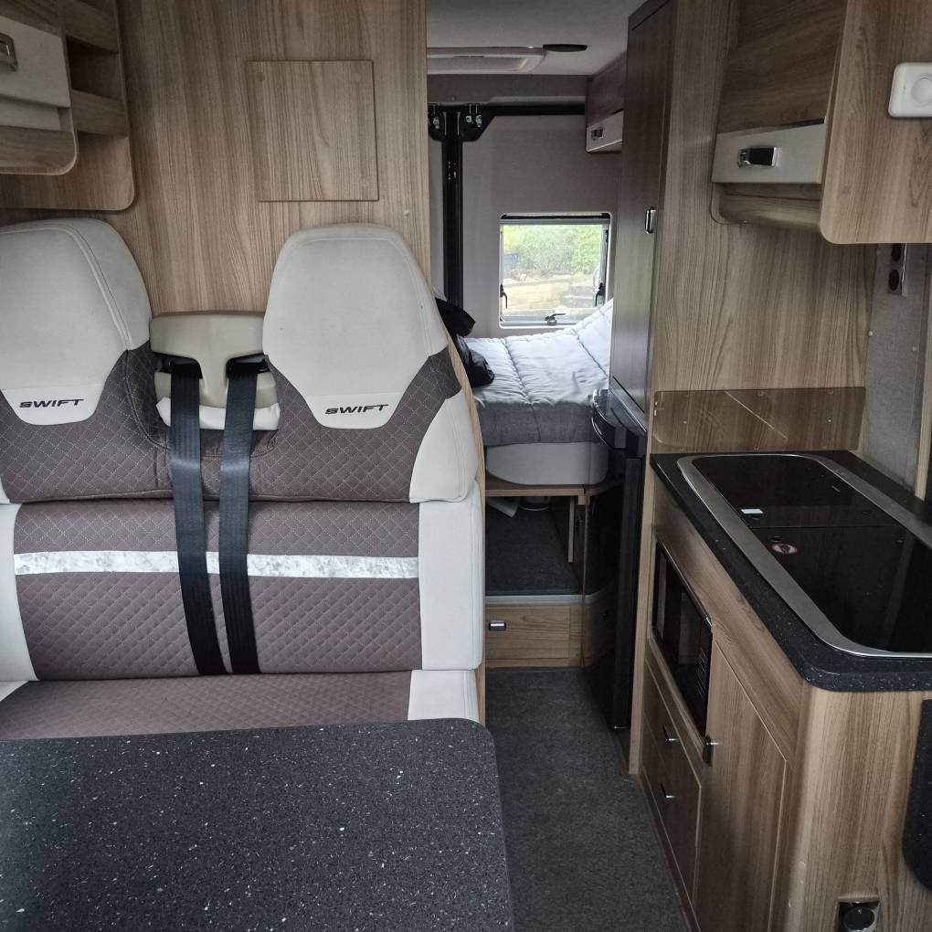 the layout of this camper comes as follows we enter through the sliding side habitation door to the front we have the two captains seats that turn to make a very comfortable 4 seater dinette with the forward facing 2 seat bench that comes with 2 additional travelling seat belts, this dinette also converts into a single bed. to the right we have the kitchen area that comes with a 2 burner gas hob microwave sink and a 3 way fridge. We then have the wash room that comes with a wash hand basin cassette toilet and a shower.