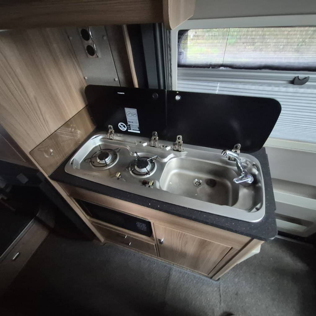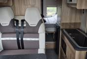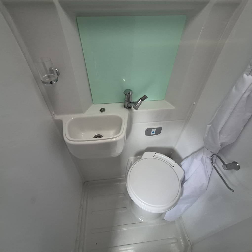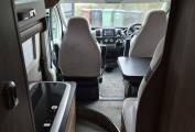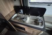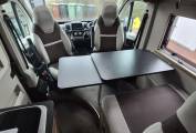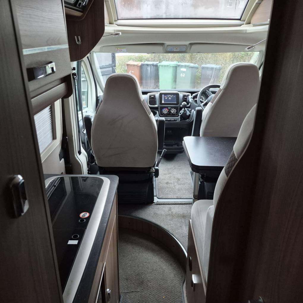 the layout of this camper comes as follows we enter through the sliding side habitation door to the front we have the two captains seats that turn to make a very comfortable 4 seater dinette with the forward facing 2 seat bench that comes with 2 additional travelling seat belts, this dinette also converts into a single bed. to the right we have the kitchen area that comes with a 2 burner gas hob microwave sink and a 3 way fridge. We then have the wash room that comes with a wash hand basin cassette toilet and a shower.