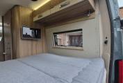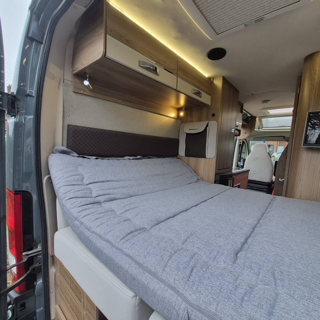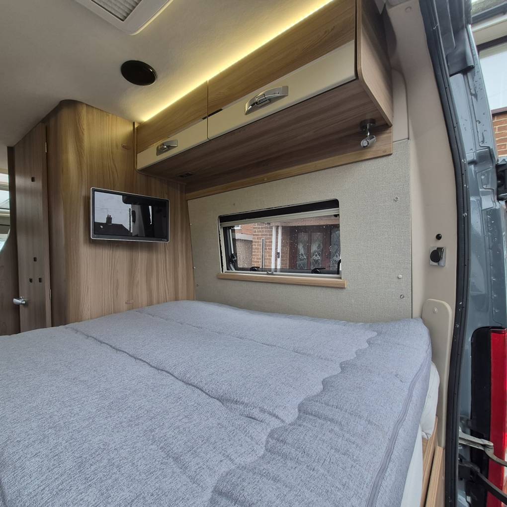 To the rear of the camper we have the fixed bed that comes with a good amount of storage space beneath it we also have an avtec tv fitted for you to relax watching your favourite tv programs as you relax in bed. The camper comes with a wind out awning, reverse camera, tow bar, external gas point and a 450wt solar panel. The heating and hot water can be run on both gas or electric.