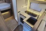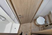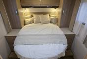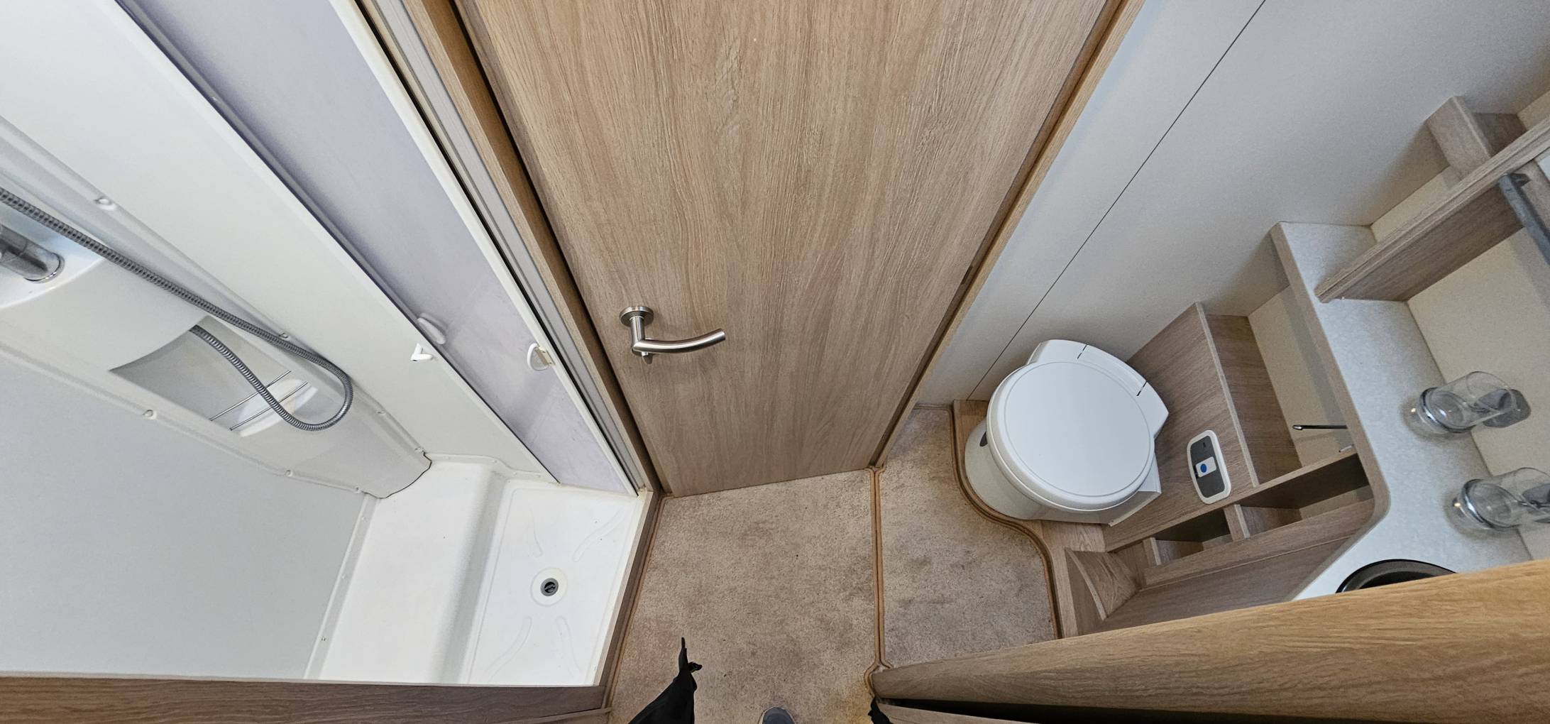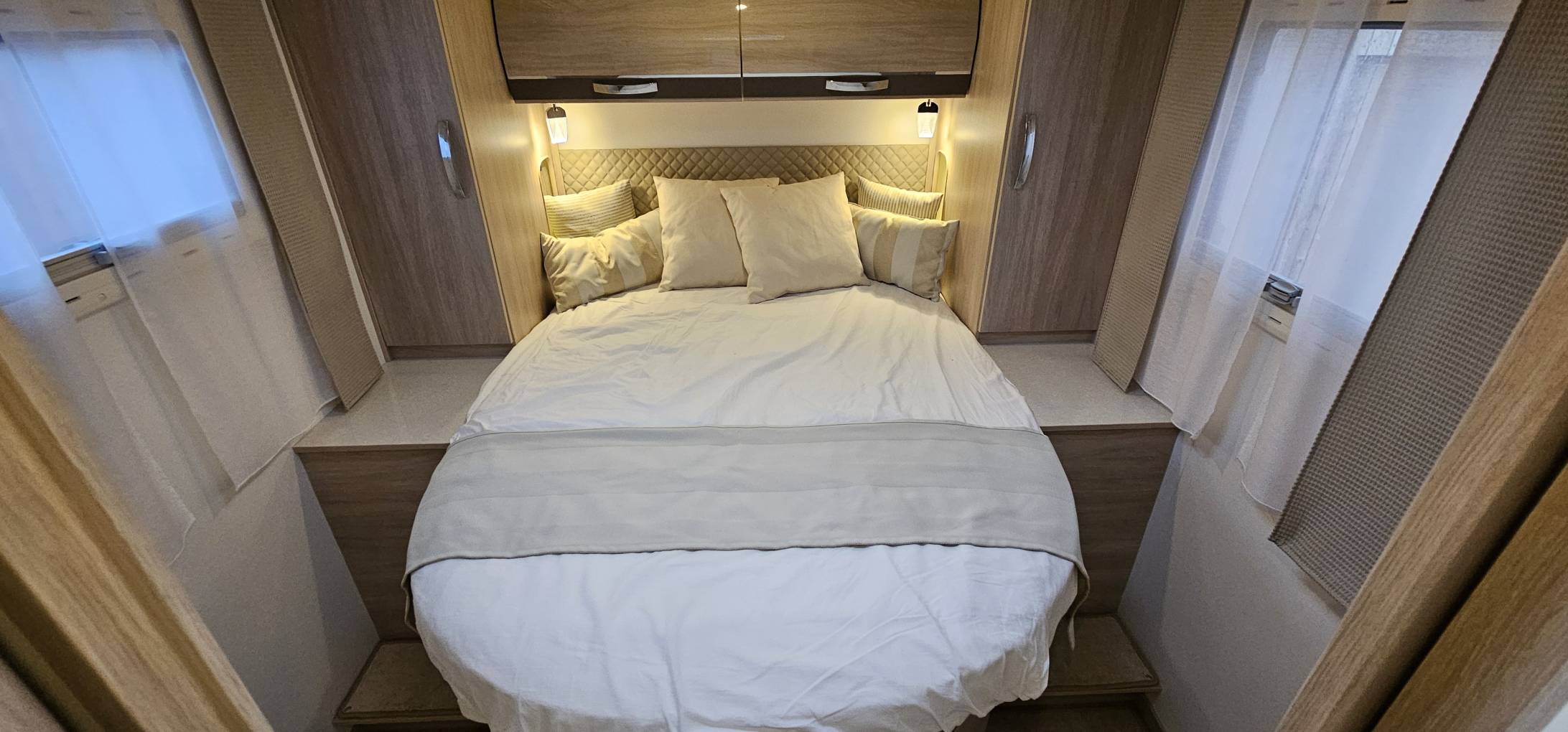 From the entrance door, you step into a lounge / dining area on the right with room to seat 6 people when the two Captains chairs are swiveled into the area. This area can be made up to a double bed at night if required. To the rear of this is the kitchen area complete with large fridge / freezer, 3-burner gas hob, oven / grill and sink with mixer tap and ample storage areas. You will also find above the fridge the Avtex TV that is connected to the Maxview Satellite dish. The TV can be discreetly hidden away behind a sliding door. The washroom is very nicely appointed and the full-size shower compartment can be found opposite. The bedroom at the rear consisting of a double island bed with storage lockers at the sides, above and below and has sufficient room both sides of the bed for easy access.