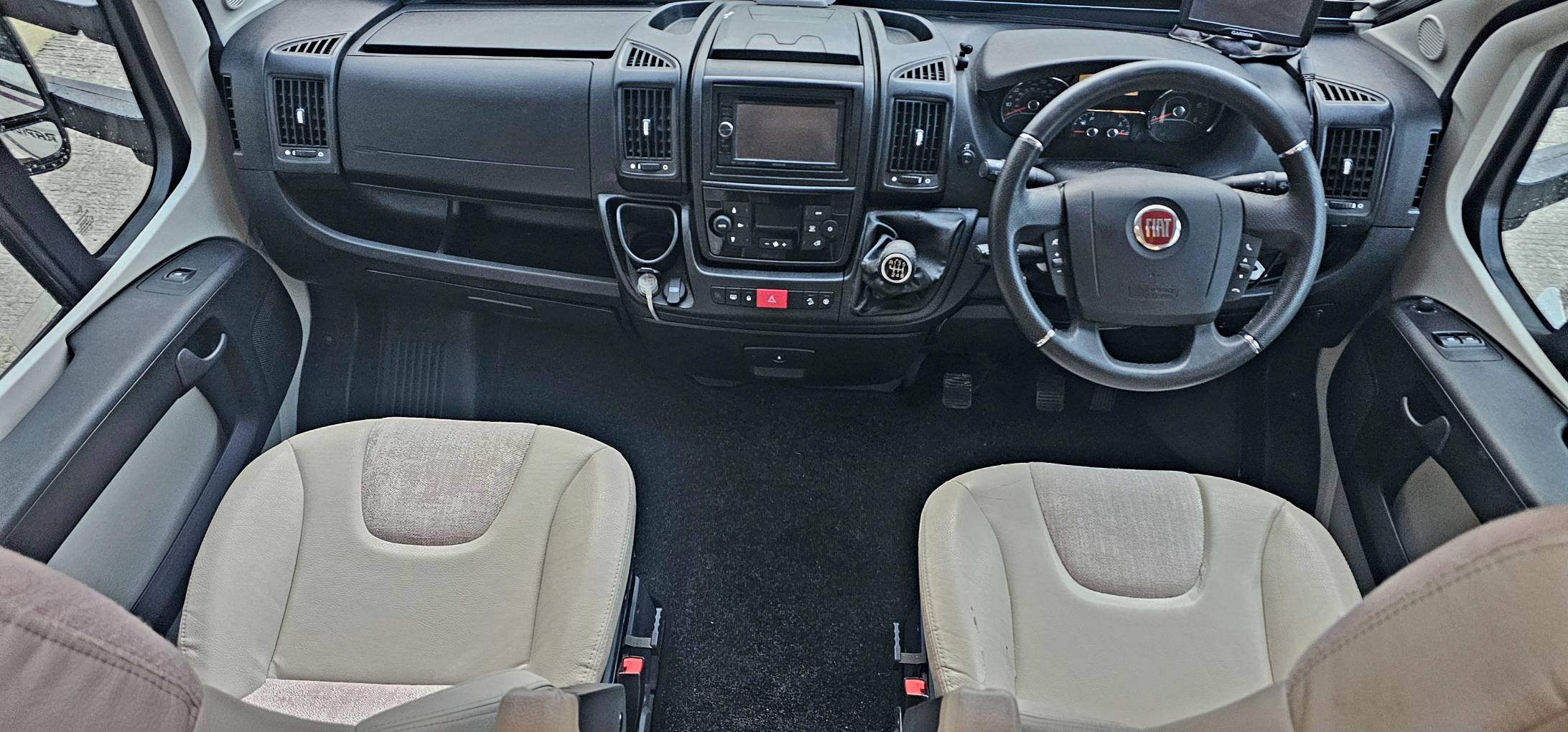 This vehicle is based on the Fiat Ducato 2.3ltr MultiJet 2, 130hp engine with 6-Speed gearbox. It comes with air-conditioning, cruise control, standard revers camera, Garmin Motorhome Sat Nav with additional integrated reversing Camera and full Remi blinds in the cab. One owner from new with a full-service history.