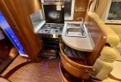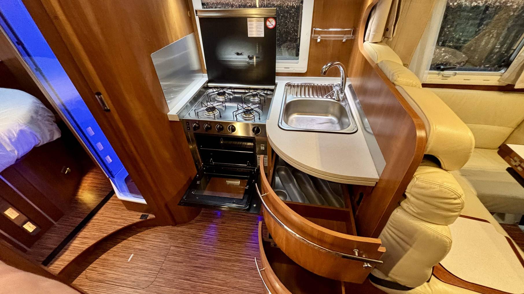 The central kitchen is beautifully appointed and very well equipped, featuring a four-ring gas hob, oven and grill, extractor fan, sink, and a large fridge freezer. Storage and workspace are generous, making it ideal for extended touring.