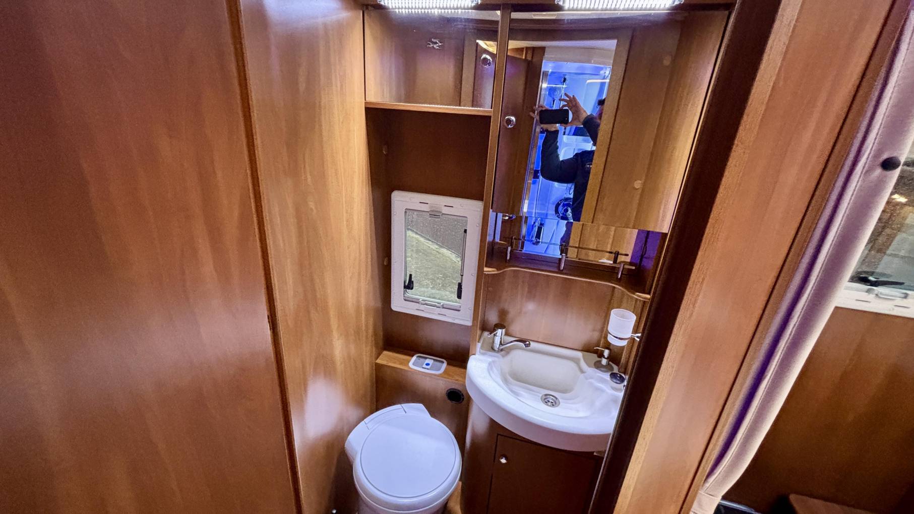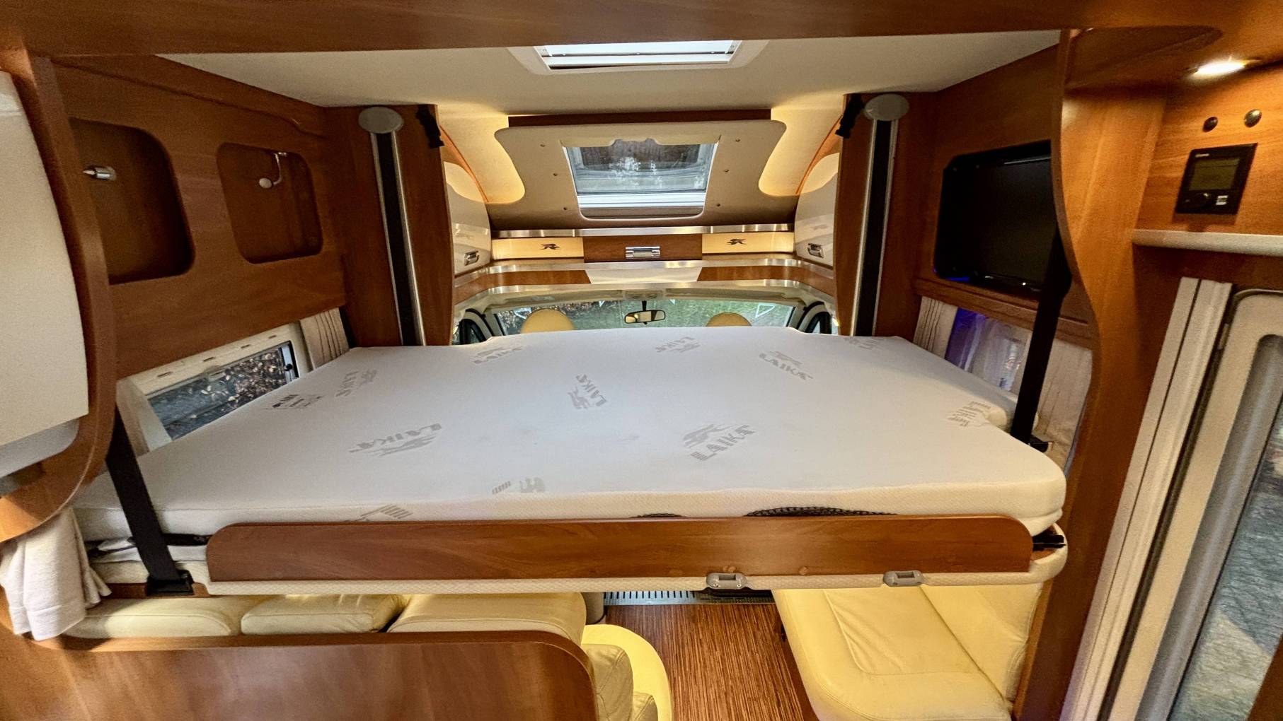 Sleeping arrangements are excellent, with a rear queen island bed providing easy access from both sides, complemented by a front electric drop-down bed. This makes it a true and comfortable four berth without compromising living space.