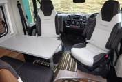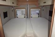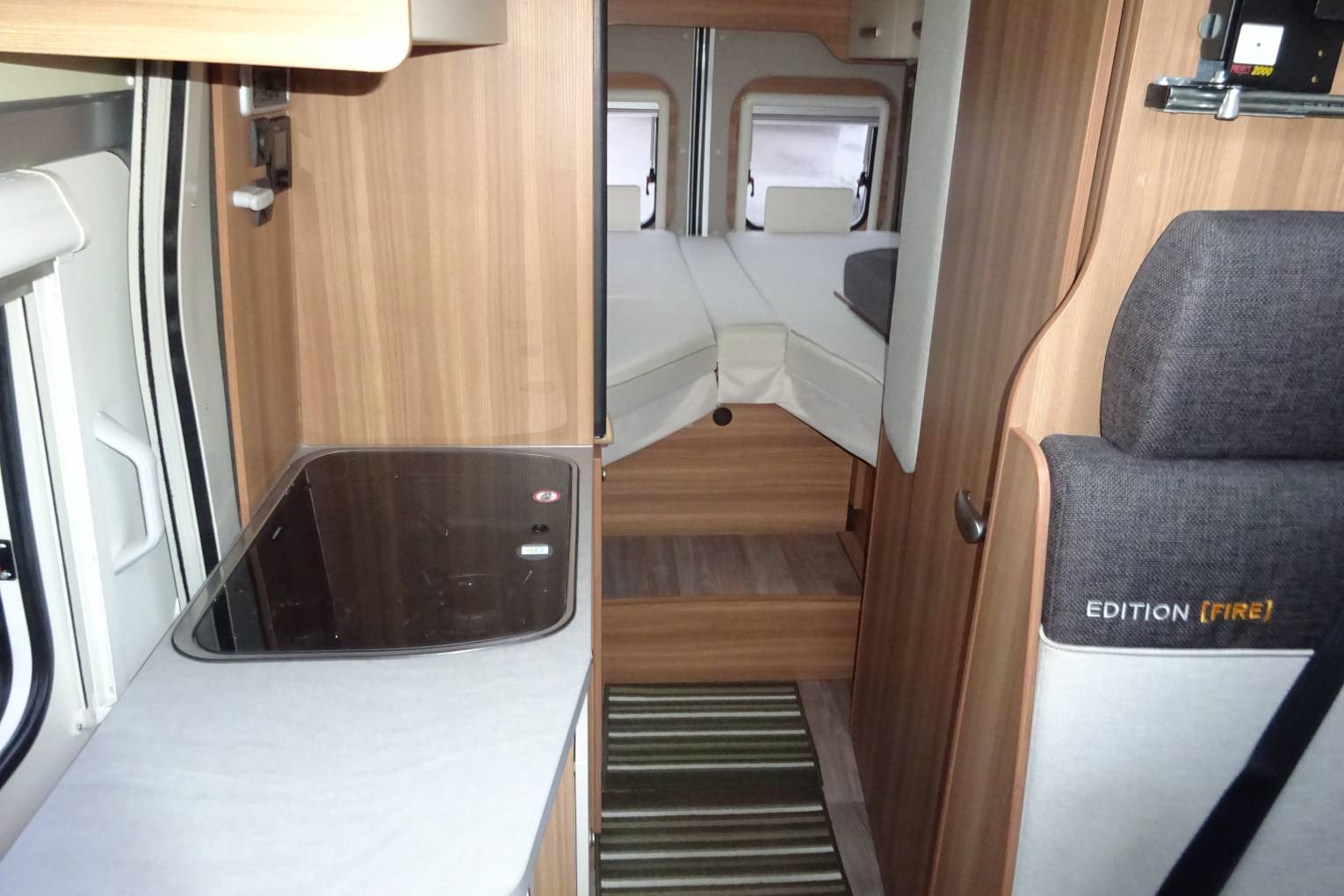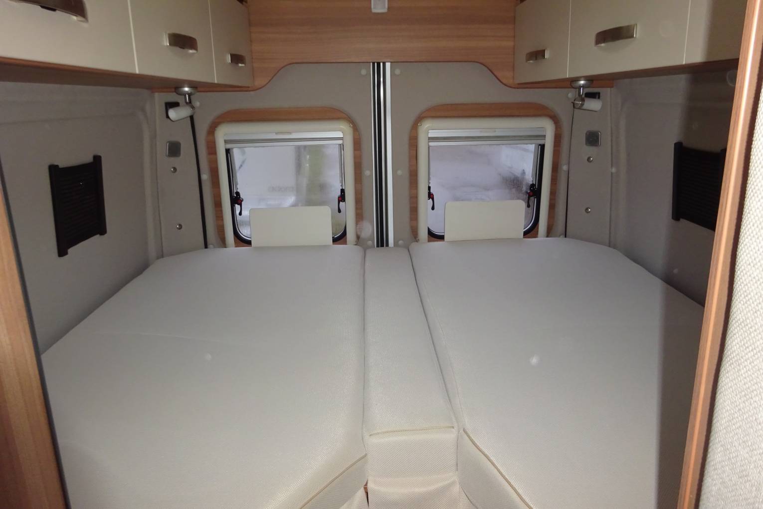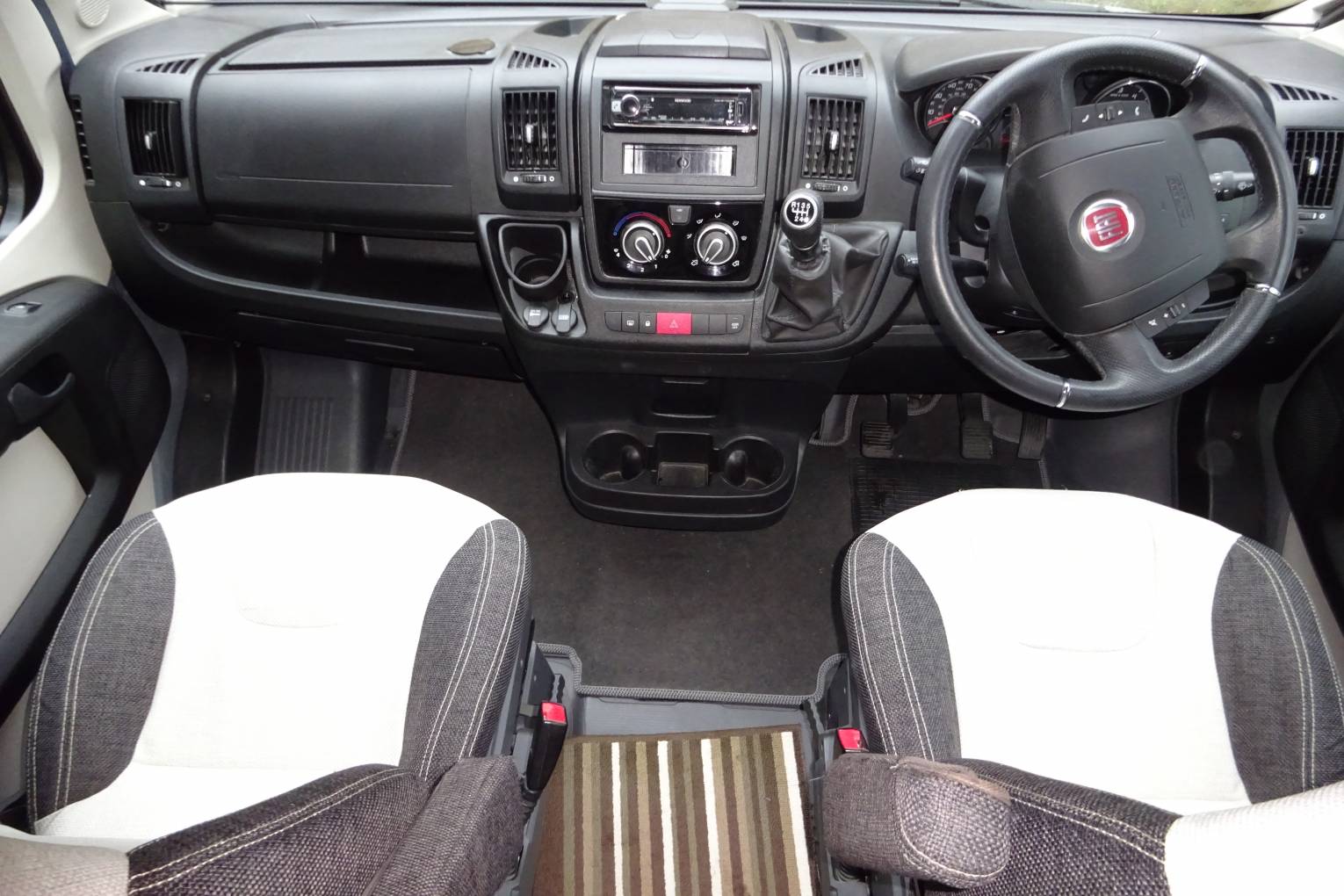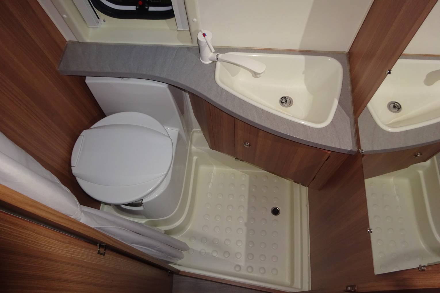 As you step inside you immediately notice that the inside is as well presented as the exterior of this motorhome. At the front of the motorhome there are two captains chairs and two extra belted seats allowing for 4 travelling seats and a seating area around the table for 4. At the rear of the motorhome are two single beds which make up in to a double if preferred. The bed is over a large storage garage that can be accessed from the inside or through the rear doors. You then come to a very nice, well equipped kitchen, fitted out with a 2 burner gas hob, sink and a fridge with ice box. There are plenty of storage cupboards and compartments throughout the living and kitchen areas giving you excellent storage in a compact motorhome. Across from the kitchen is a lovely bathroom equipped with sink, toilet and a shower.
