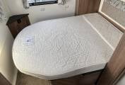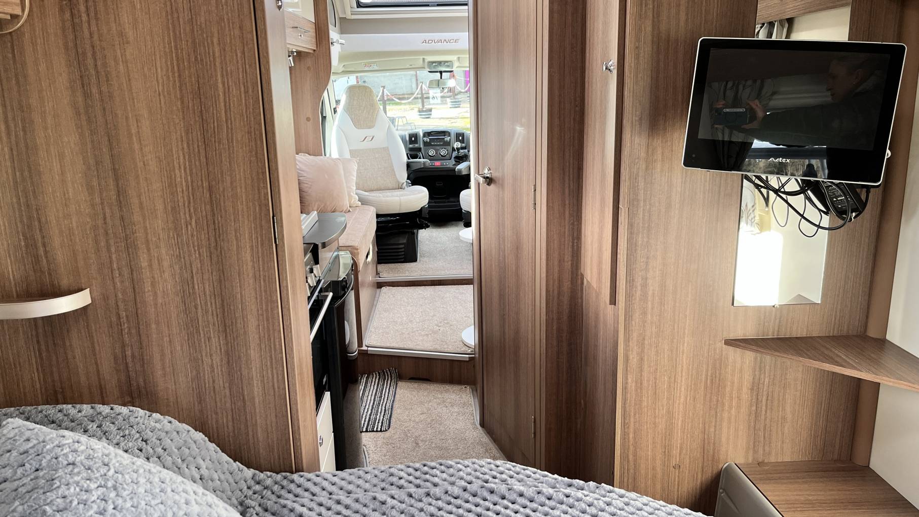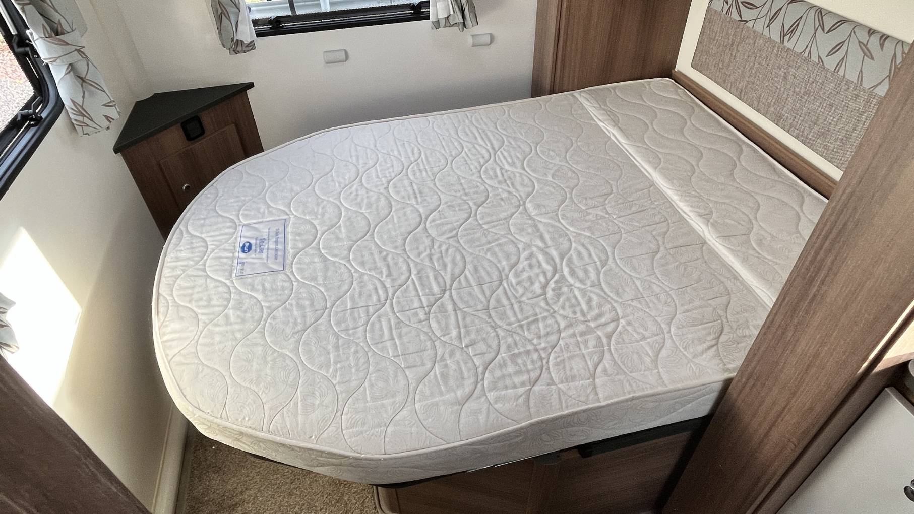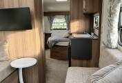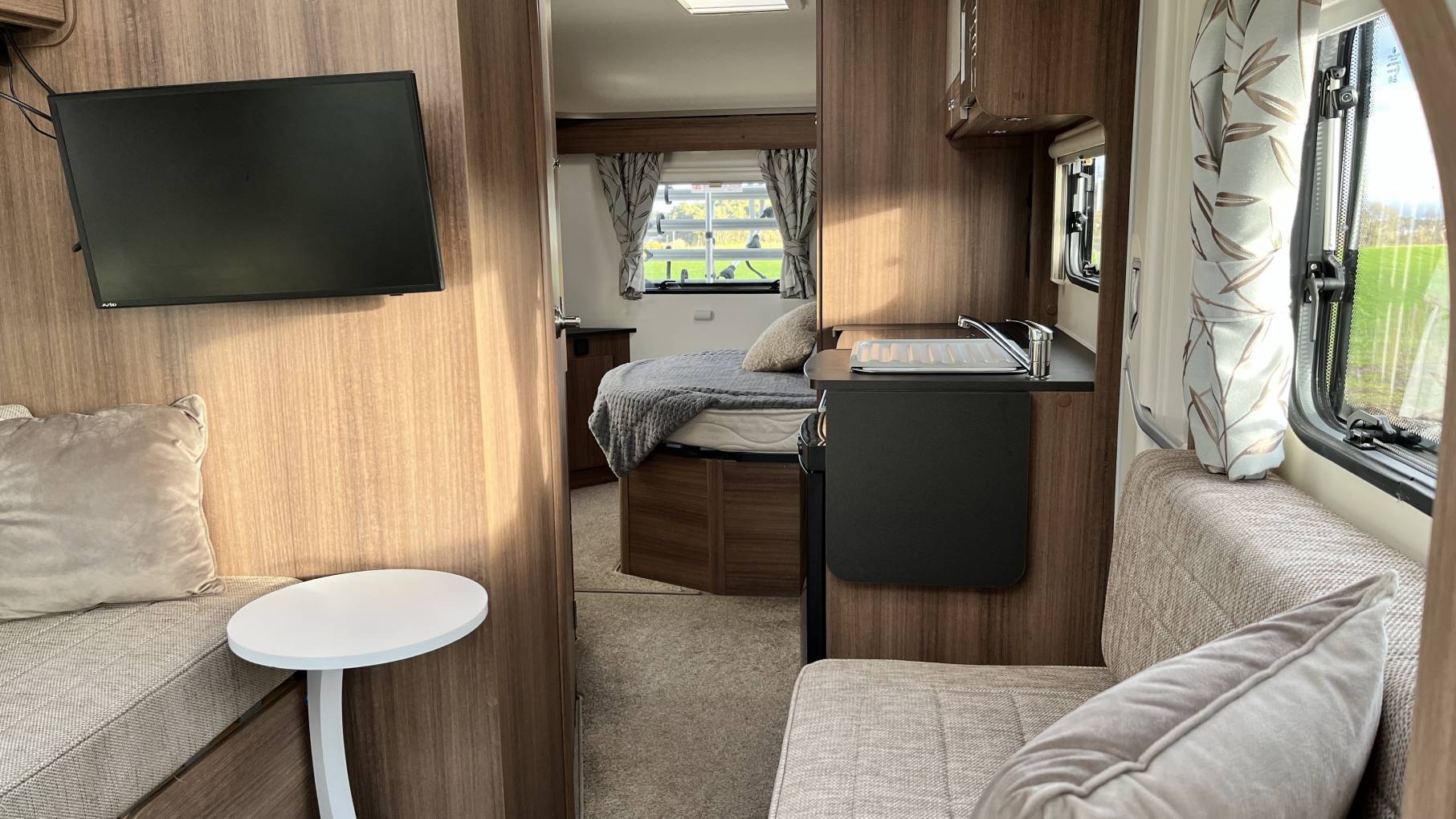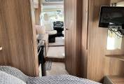 Sleeping: Island double bed to the rear with over bed storage, vanity mirror and cupboard, plus large locker under rear bed. Avtex TV, curtains and blinds for privacy, 2x wardrobes. The lounge converts into an additional double bed.