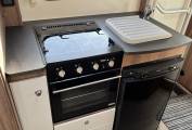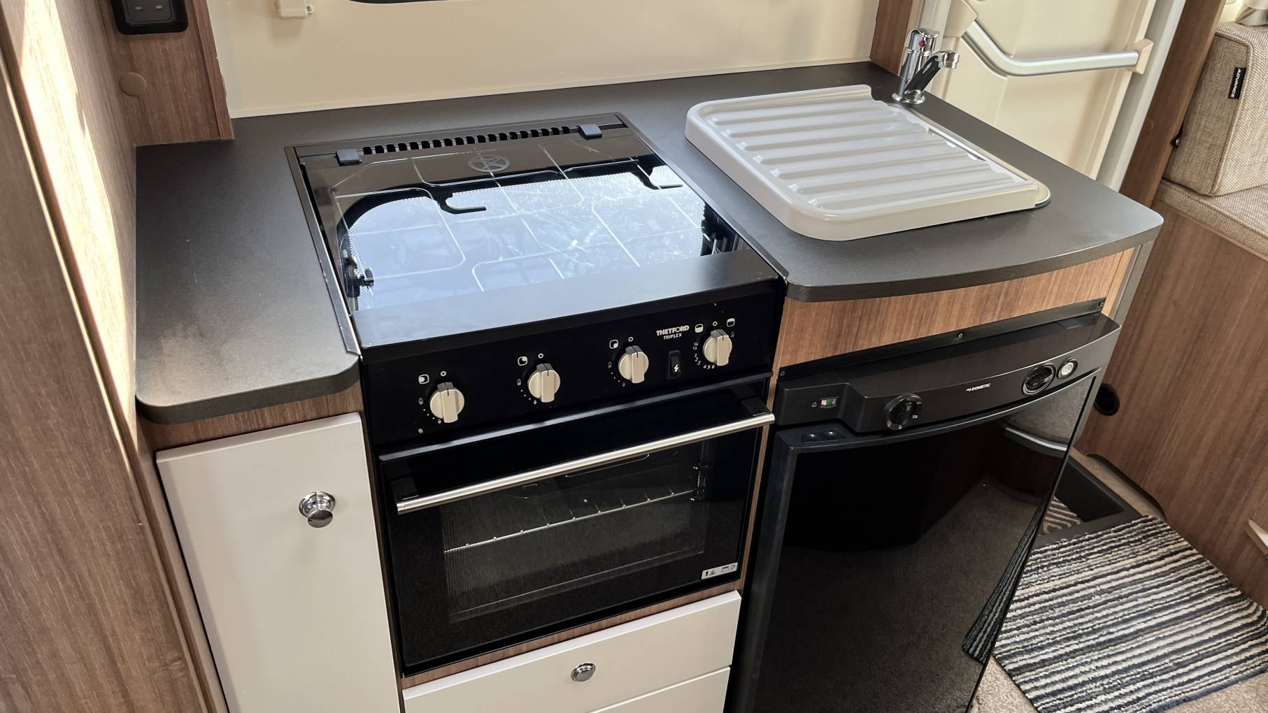 Kitchen: 3 x burner gas hob, combi oven & grill, sink with hot and cold running water, 3 way fridge freezer, inbuilt microwave, good storage for kitchen items, extending kitchen workspace, plus 240v power plugs and lighting.