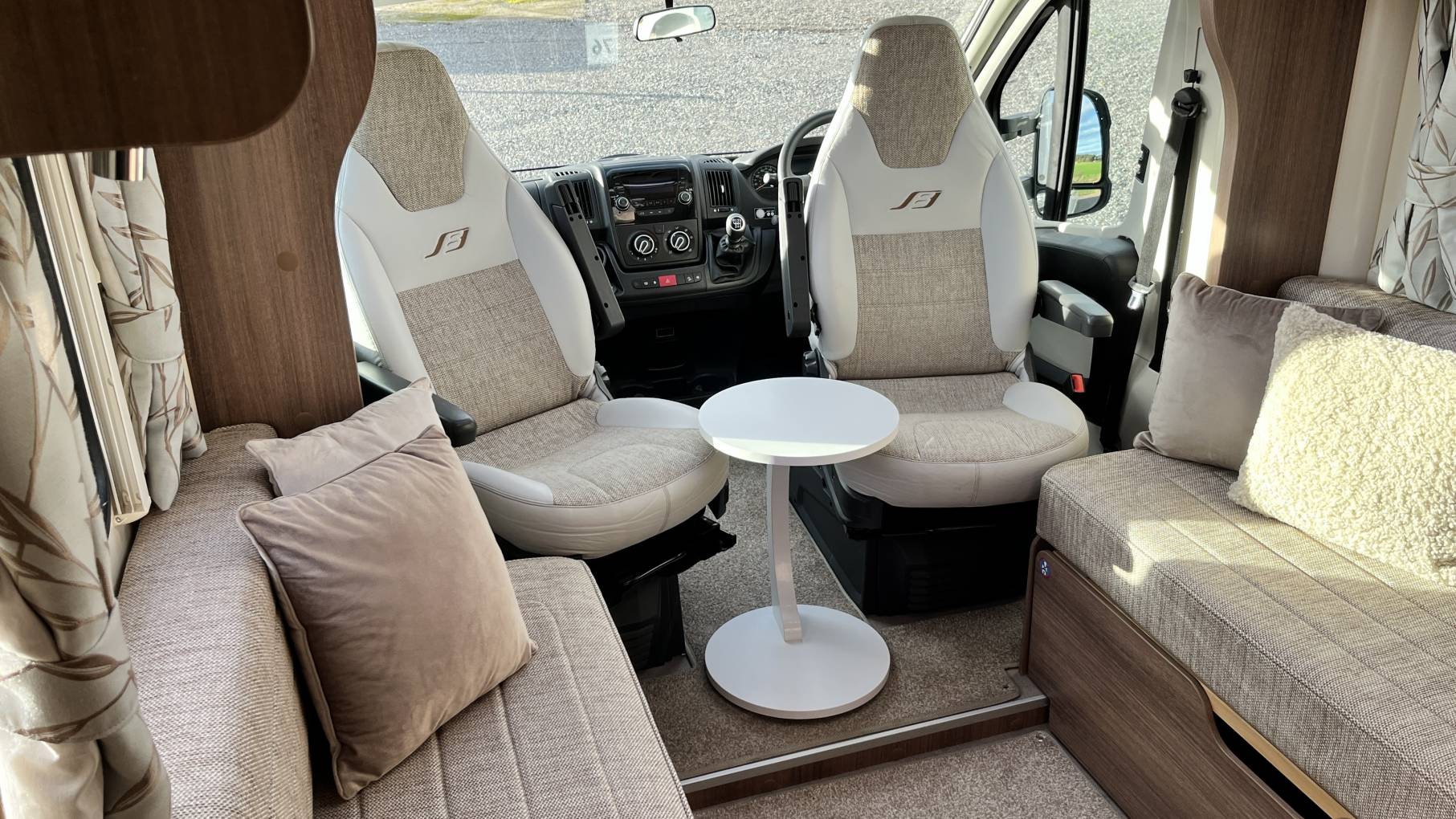 Living/Dining: Front lounge with 2x bench seats, swing out Avtex TV/DVD, side table, cab seats with arm rests and swivel bases, black out and fly screens on all windows. Very light and spacious area for lounging. A freestanding table creates a spacious dining area.