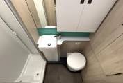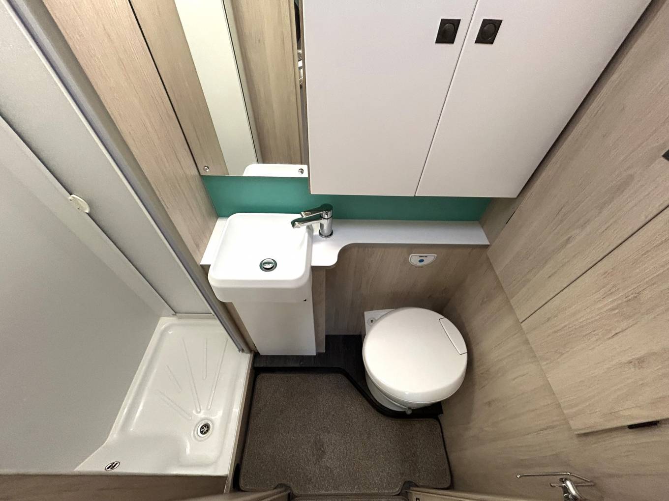 To the rear of the vehicle is the spacious full-width washroom with a separate shower cubicle, vanity handwash basin, Thetford cassette toilet and plentiful storage.