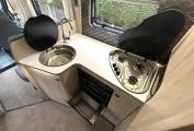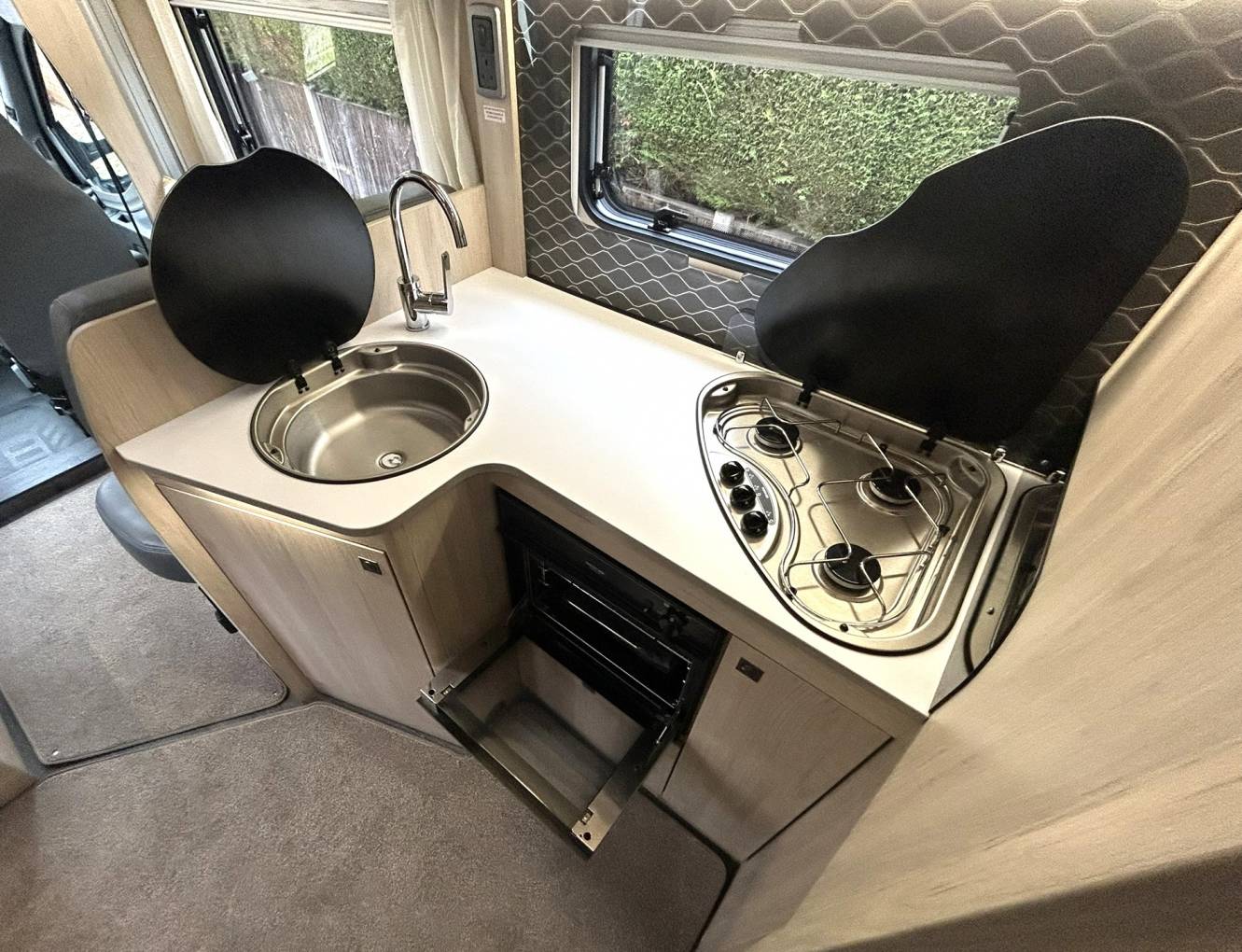 To the centre of the motorhome, you will find the fully functional kitchen with a 3-burner gas hob, sink with hot & cold mixer tap, combined oven and grill and large slimline 150L fridge with freezer compartment.