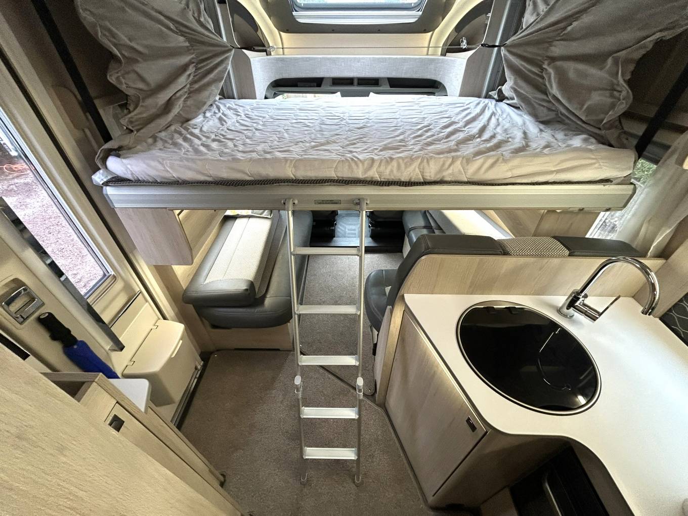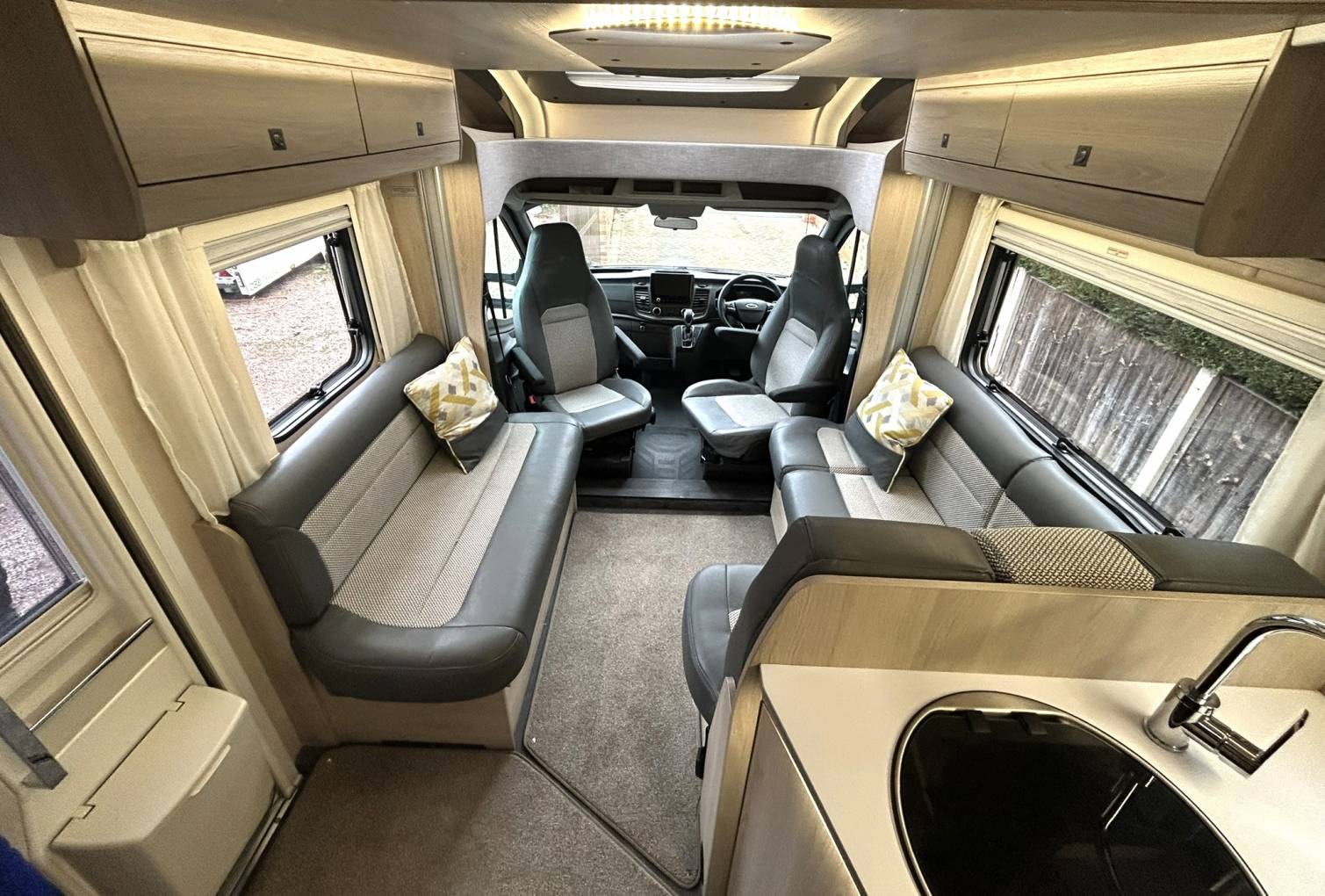 The motorhome comes with Automatic gearbox, 4 travelling seat belts, Media system which includes, Bluetooth, DAB radio, Apple CarPlay, reversing camera and sat nav. The cab also benefits from cab air con, cruise control and front cab blinds. The motorhome also comes with the Whale heating & hot water system, a microwave, carpets, solar panel, TV & aerial, gas bottle, brackets ready to take a bike rack, external BBQ point, electric step, wind-out awning, and 240v hook-up cable.