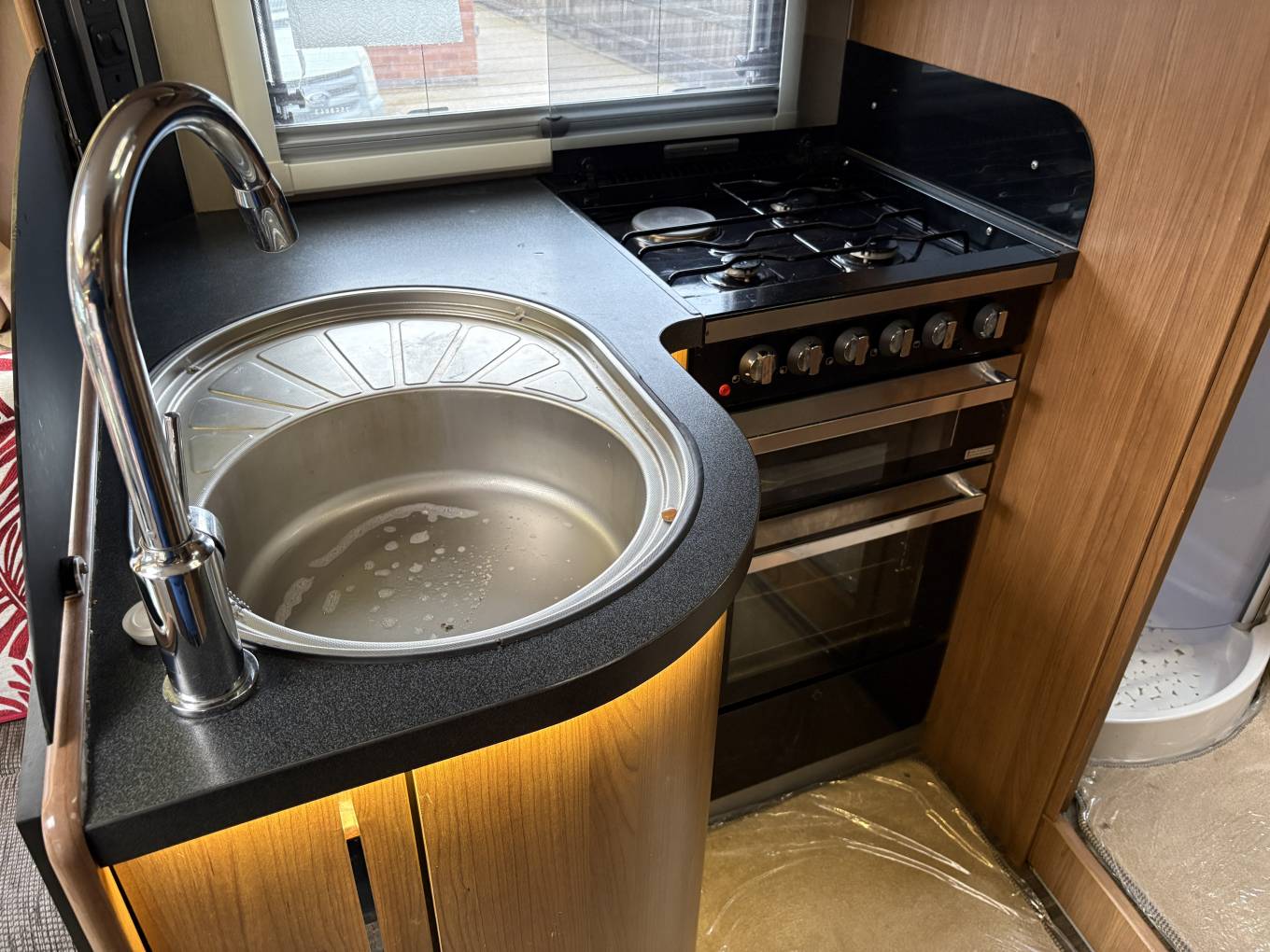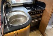 The Kitchen has a three Burner Gas and One Electric Hotplate Hob, a separate Grill and Oven, a Three Energy Source Dometic Fridge freezer, a Microwave Oven, a Sink with Hot and Cold Mixer Tap plus plenty of cupboards and worktop space.
