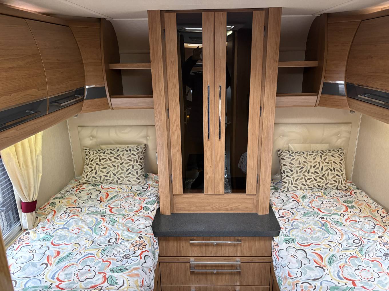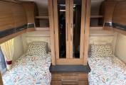 At the rear of the Motorhome you have the Bedroom where there are 2 good sized single fixed beds, TV, 12v and 230V sockets, generous wardrobe with a lockable safe, set of drawers and over head storage. Access to the garage are can be found under the beds.