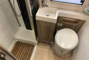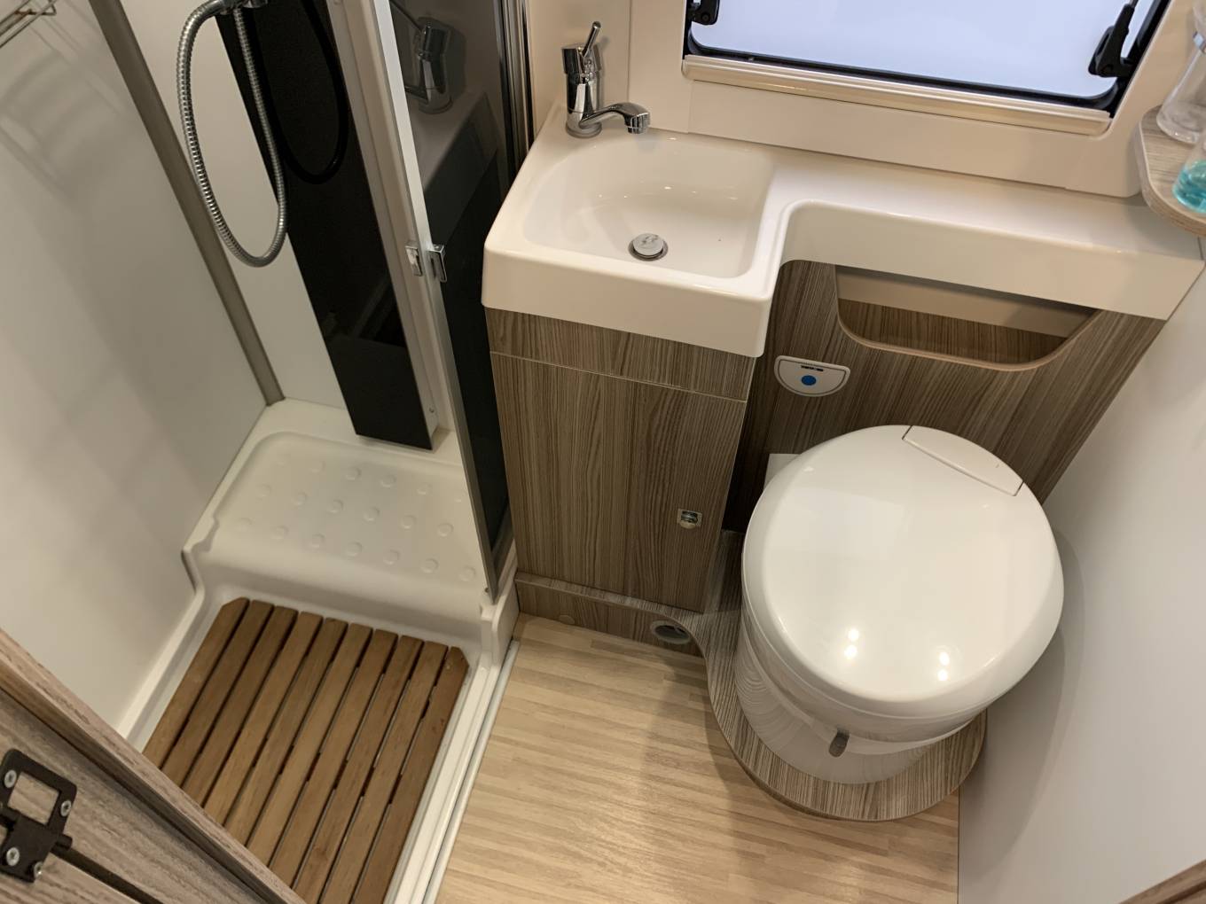 The washroom, has a separate shower cubicle with removable wooden duckboard and plastic wall linings, a fixed basin and a Thetford electric flush swivel-bowl toilet on a plinth.