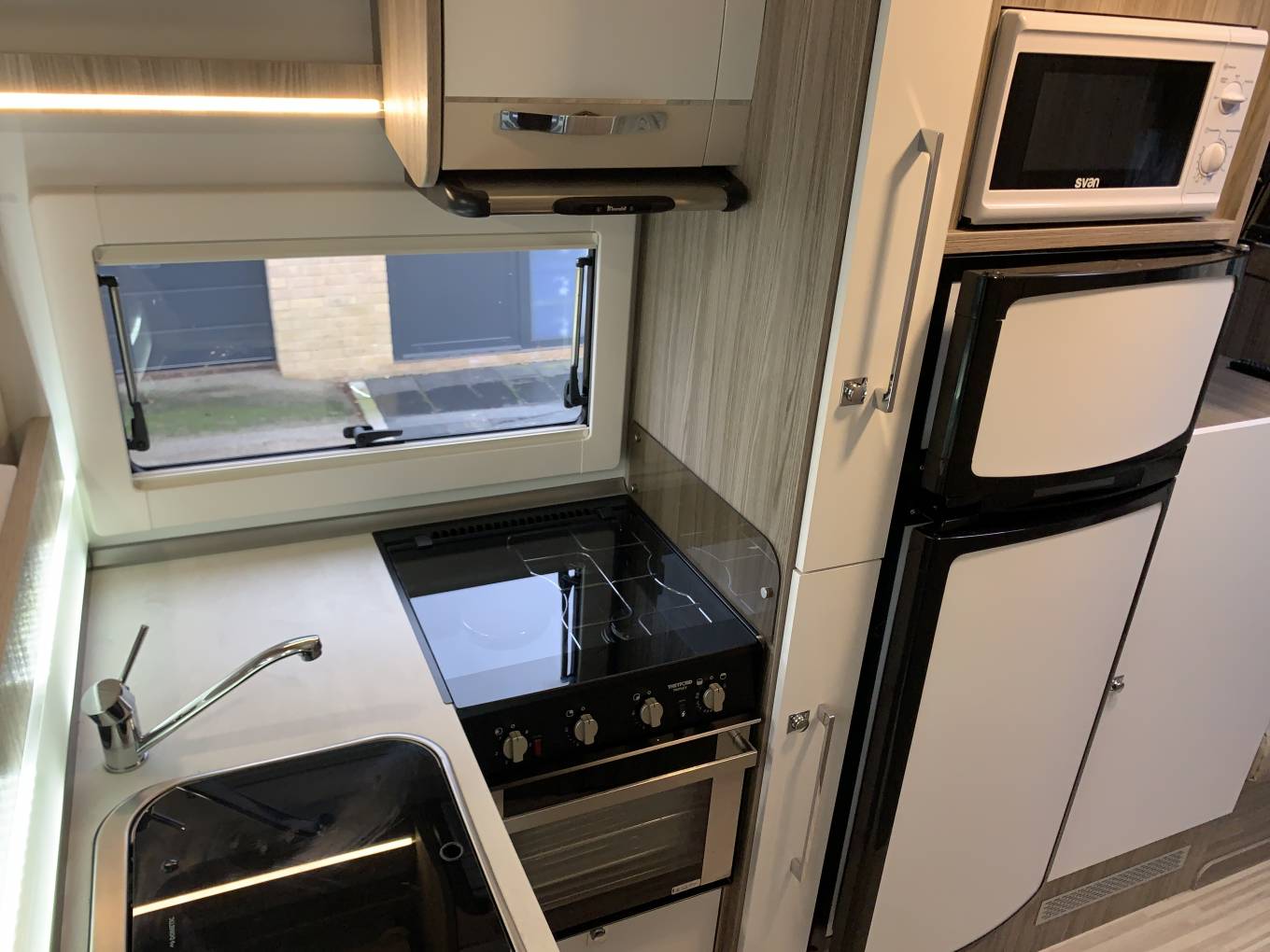 The rear and front electrically operated doubles are dived by the L-shaped kitchen and washroom, the kitchen comprises a Thetford Triplex cooker (two gas rings, one electric hotplate, combined oven and grill), plus microwave oven, 145-litre fridge/freezer with automatic energy source selection, rectangular sink abundant storage – drawers, slide-out racking, etc.