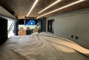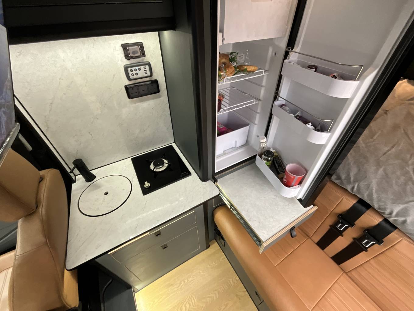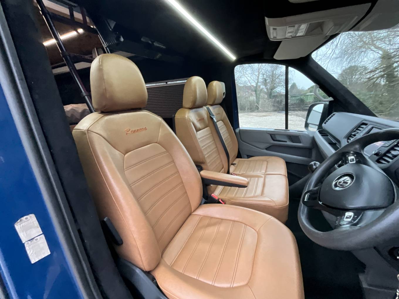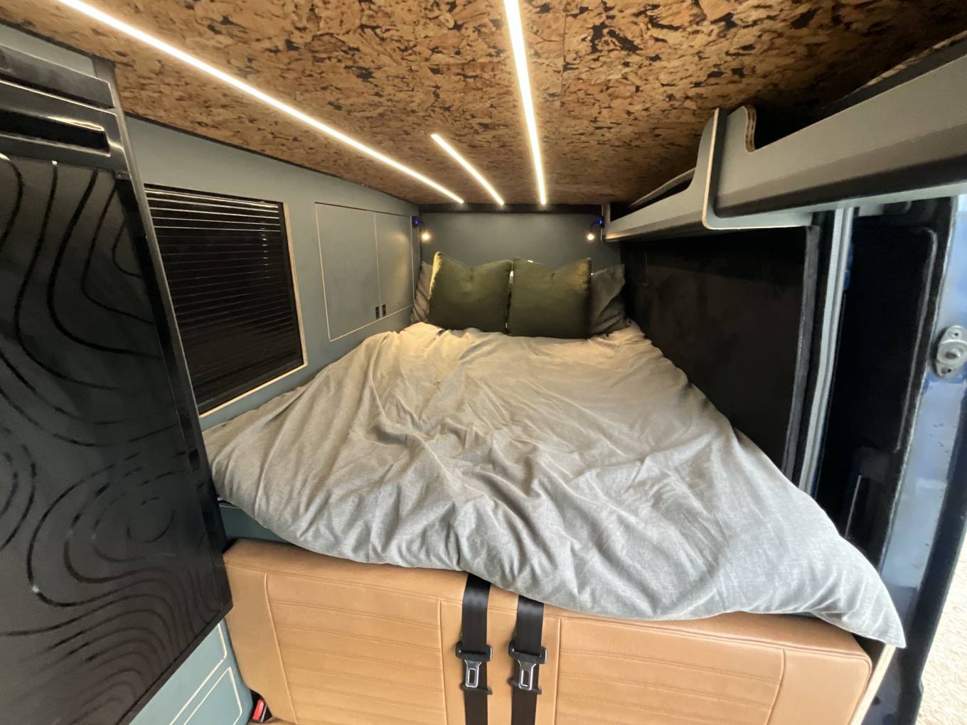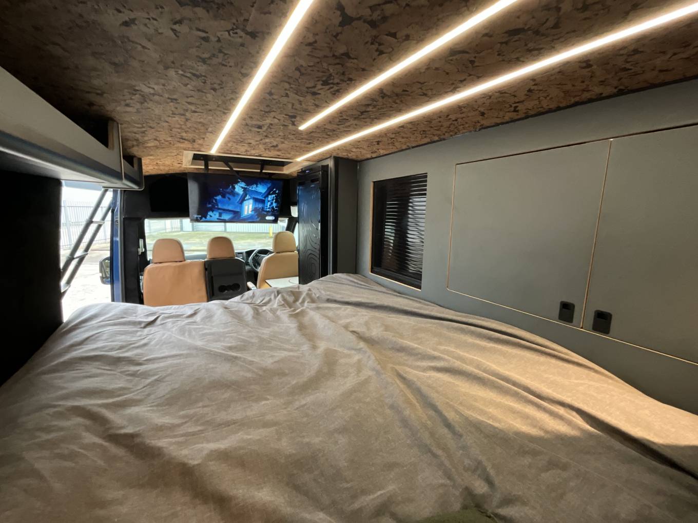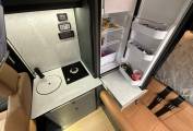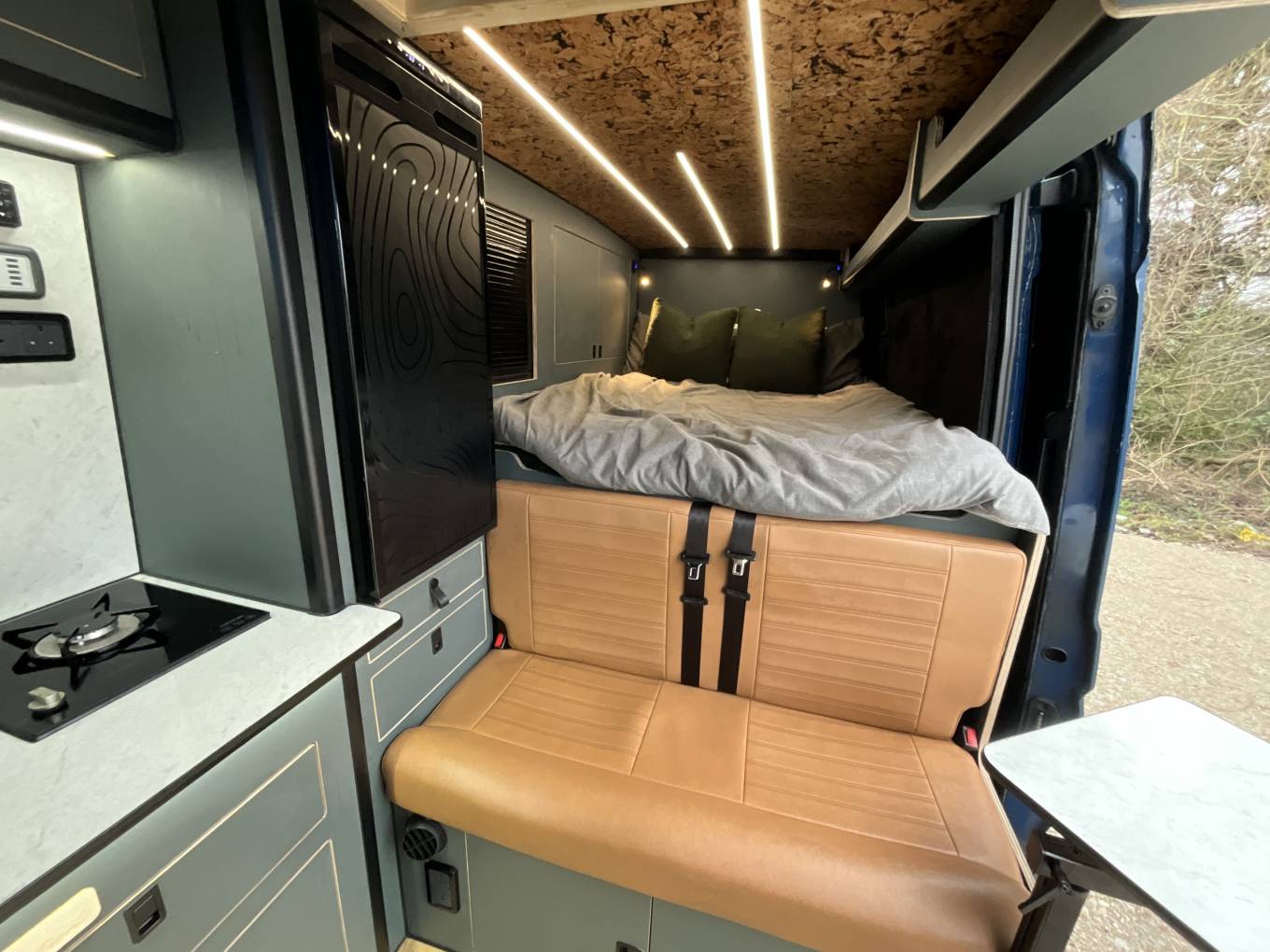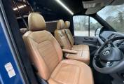 Entering through the side door we are greeted by the attractive interior complete with strip lighting and complimented by the tan leather style upholstery. Here you will find the Thetford single gas hob, sink, 90L fridge/freezer, clever pull out chopping board and plenty of storage. For dining there is a swivel table which can be easily manoeuvred to give you the space to relax while watching the 32” cello smart tv. To the rear of the campervan you will find the comfortable fixed double bed complete with 2x touch reading lights with USB. Under the bed is an abundance of storage including a large pull out heavy duty draw. Finally you will find the second sleeping area in the pop top which you can access using the extendable ladder. This pop top has a panoramic canvas giving plenty of natural light and views for miles. With masses of additional extras, this campervan represents great value