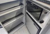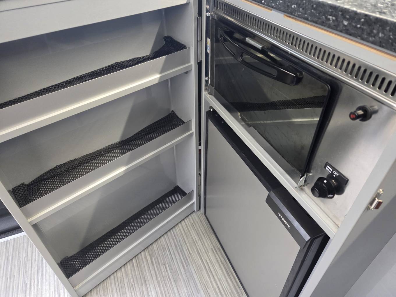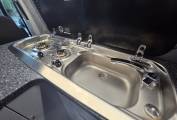Equipped with essential amenities, the compact yet functional kitchen includes a two-burner gas hob, a sink with a glass lid, Grill and a 50-liter fridge. There is ample storage space for kitchen essentials, ensuring you can prepare meals on the go.
