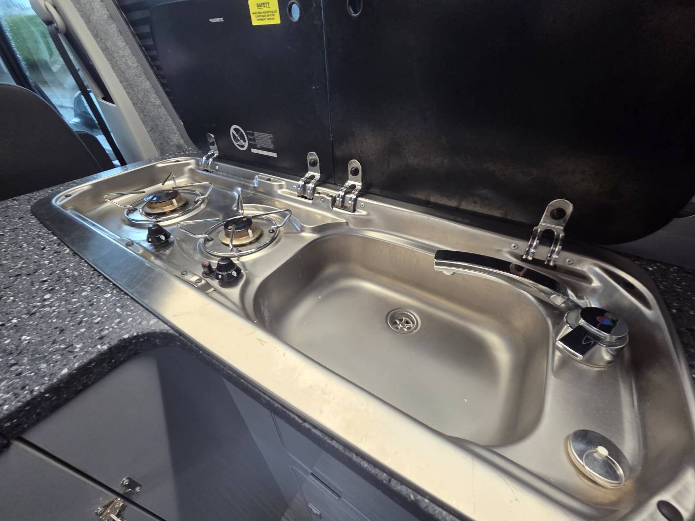 The campervan offers comfortable sleeping options for up to four people. The rear bench seat easily converts into a double bed, while the pop-top roof provides an additional sleeping area, ideal for children or extra guests.This poptop is on hydraulic struts making raising and lowering a very easy job and is very well lit.