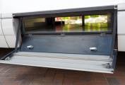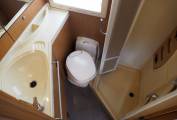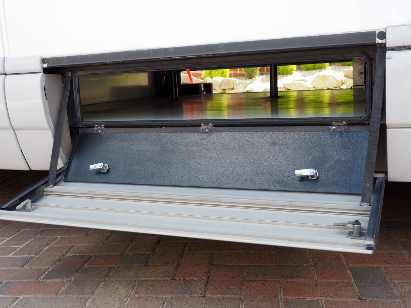To the rear corner is an excellently planned washroom with fully lined shower cubicle, toilet and vanity sink with exceptionally deep storage above. Both the kitchen and washroom are partially built over the rear garage, which has enough room for a small scooter, bikes or hobby gear. Being on Alko chassis from the cab back, this is a true double floor motorhome with a storage compartment under the dinette floor, and like the garage, has access either side.