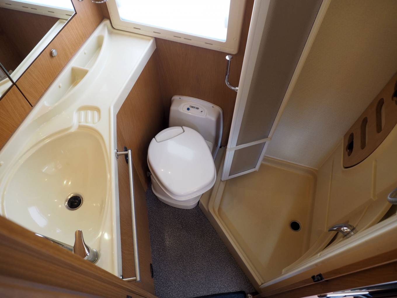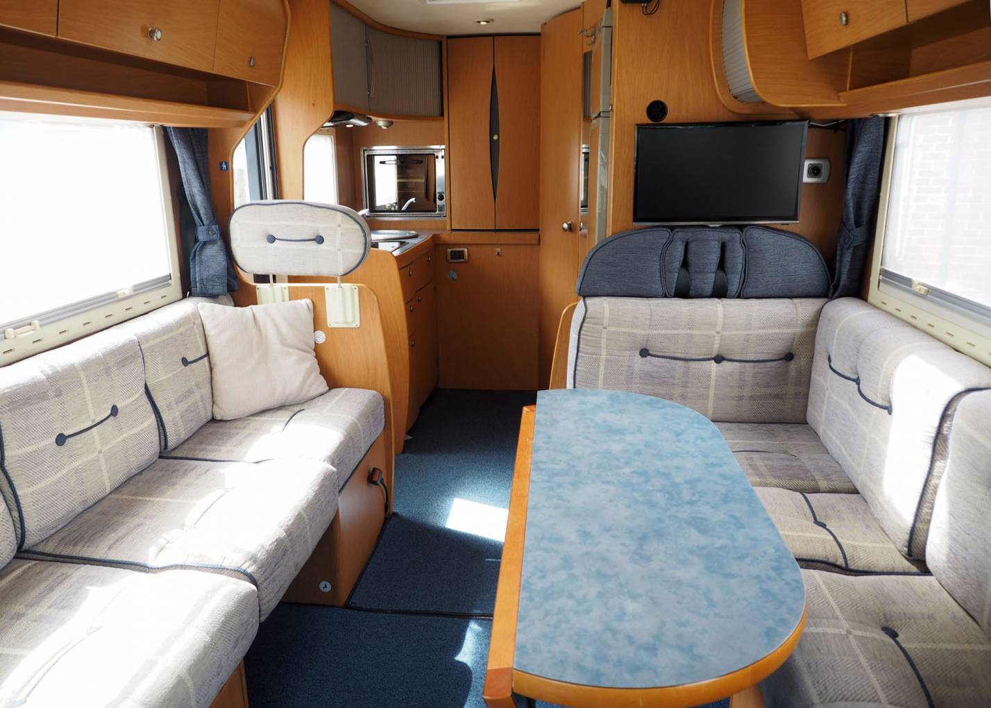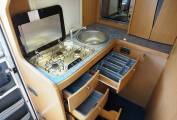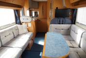 The layout comprises of a roomy forward lounge with L shaped seating opposite a bench settee and swivel seats. Six or more could sit here for a social. There are 5 travelling seats available in total, all with 3 point belts. The side settee can also convert into a mini dinette wih its own table. Over the cab is a substantial drop down bed with an extension to allow transverse or longitudinal sleeping. The dinette can also make a single and a three quarter bed, a push for five to sleep but certainly good for four. Midships you will find a large fridge freezer and storage, while the beautifully designed kitchen is of corner style to the rear, with a range of storage options, oven and grill, gas hob and deep kitchen sink.